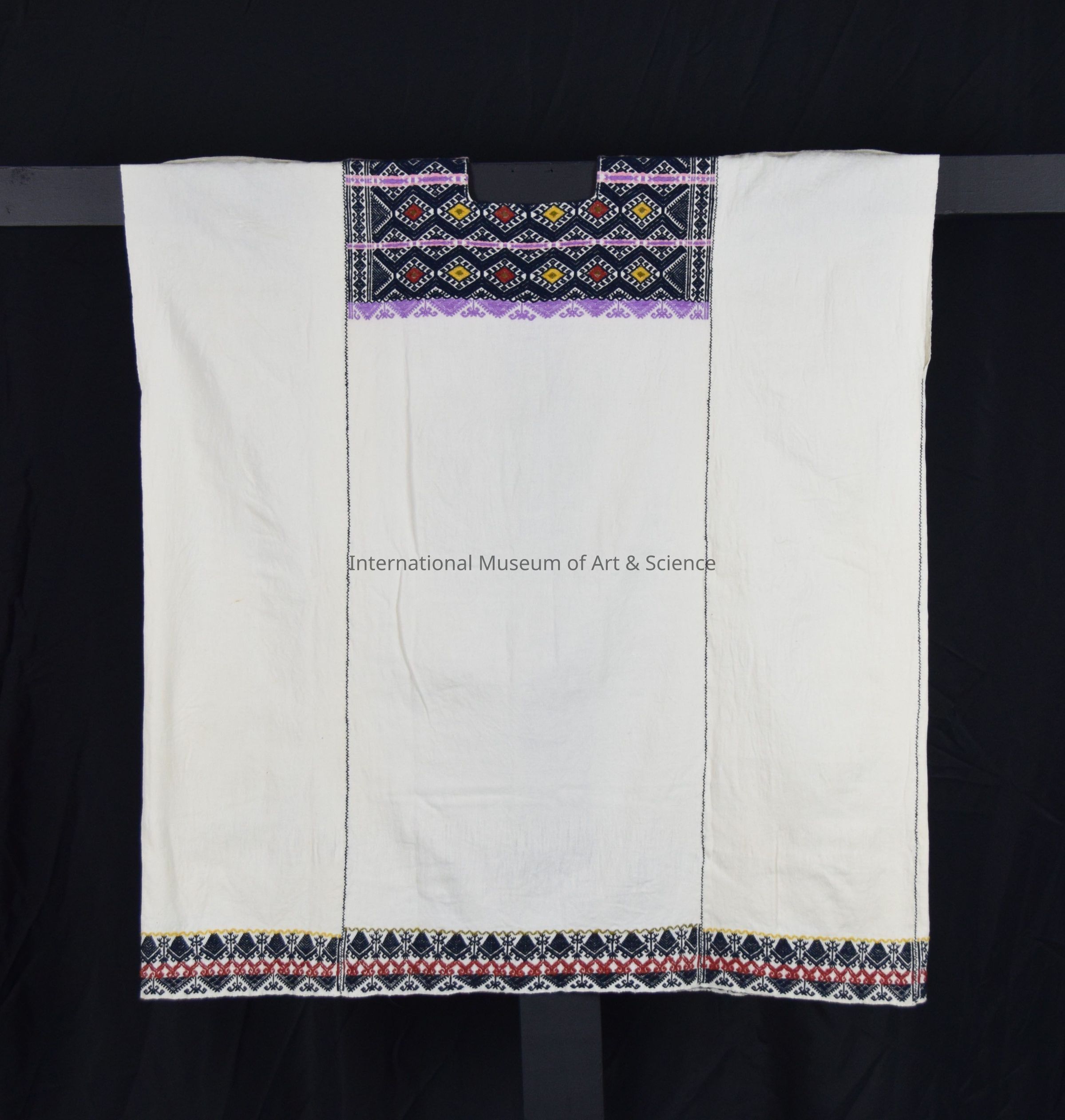Huipil. White cotton blouse; square neck; dark bluish-black designs with wiolet horizontal rows; diamonds of yellow and rust orange.