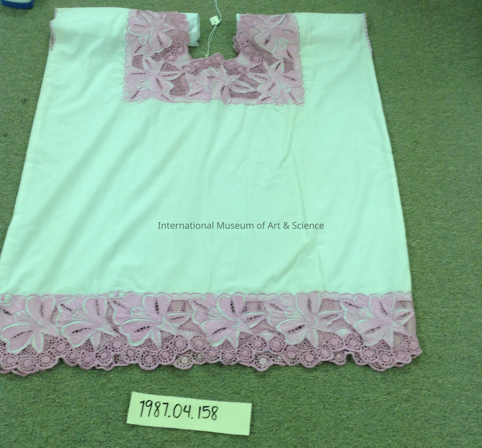 Hupil (Blouse). Machine stitched, cotton/polyester material. Long, white sleeveless blouse with pink embroidery of floral design at neck, hem, and armholes. Width of embroidery at hem is 5 1/2" wide (14.0cm).Artwork Details