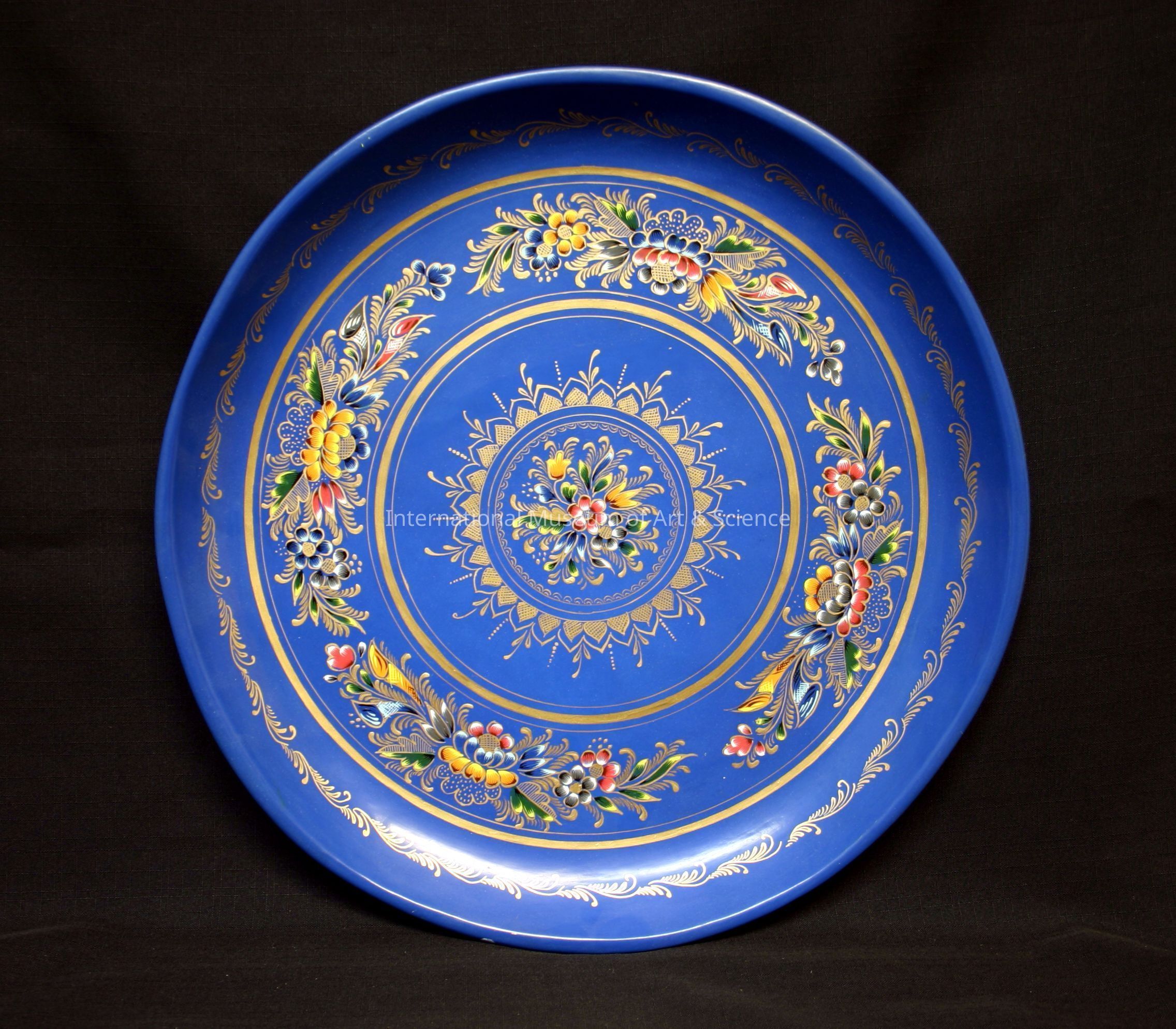 Platter. Uruapan, Michoacan. Maria Salud Angel, Carmen Berber, Rosa Sanchez. Aile wood, lacquer, gold paint, commercial paints. 1986. Large decorative platter; shallow, exterior is dark brown; elaborately decorated, interior background is blue; border has gold feather motifs, solid gold bands; multi-color floral designs. Made by decorado fino process- surface painted design.