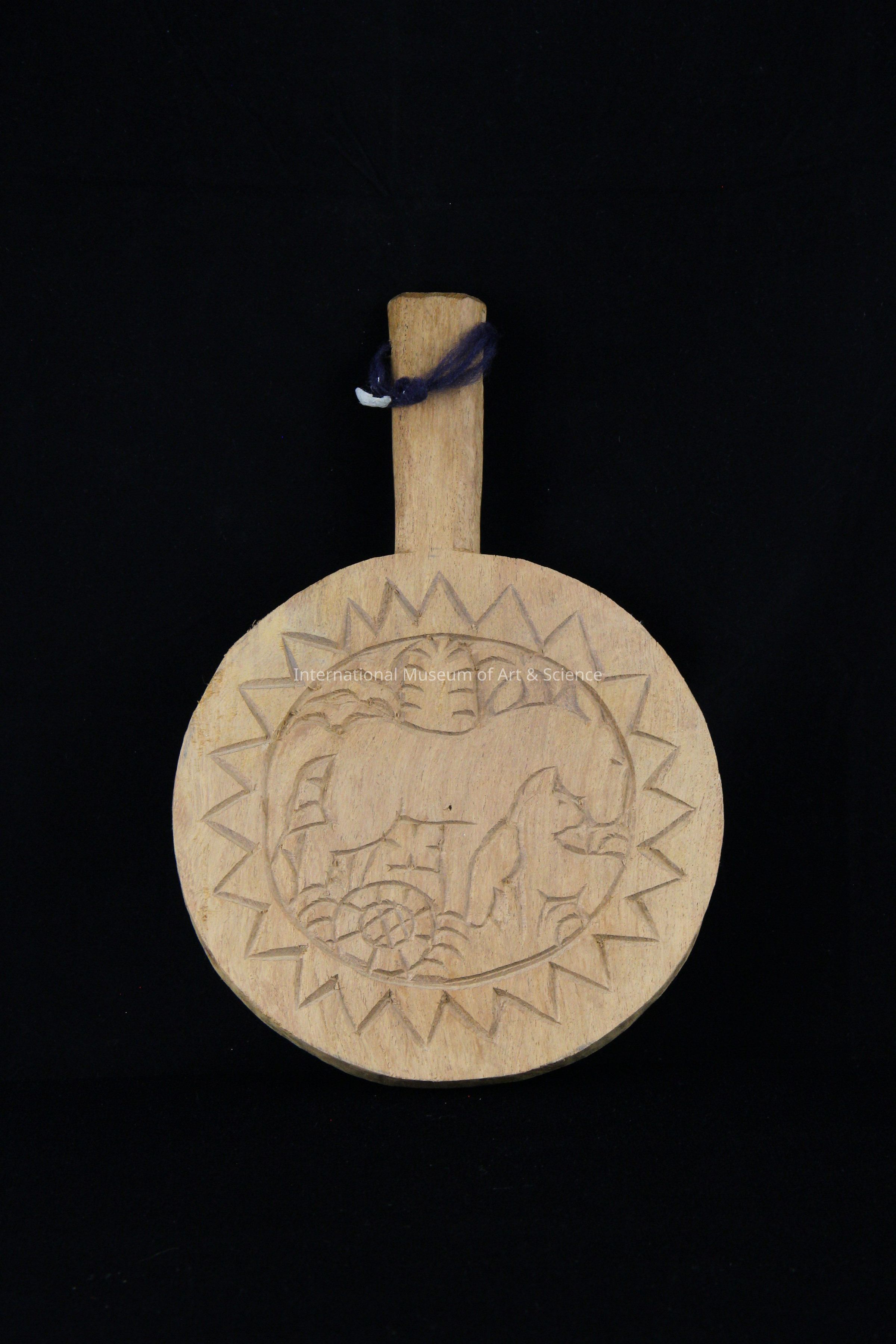 Wooden cutting board with handle. tThe sun, a horse, and a calf are carved onto one side. The piece has no finish. There is a piece of black yarn tied on the handle.Dimensions
