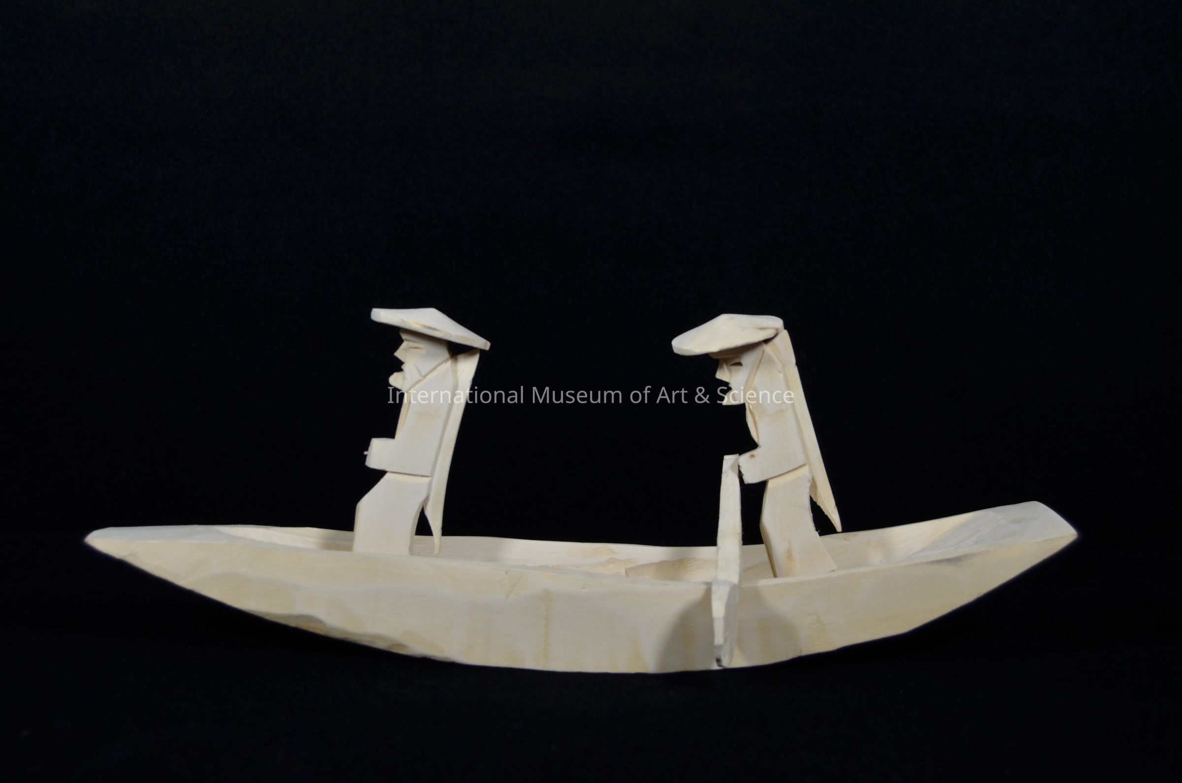 Unpainted boat; two crudely carved fishermen figures; crescent concave boat; round hats on fisherman; one holds fishing pole that has white cotton string and fish attached; other has wooden fishing paddle.Artwork Details