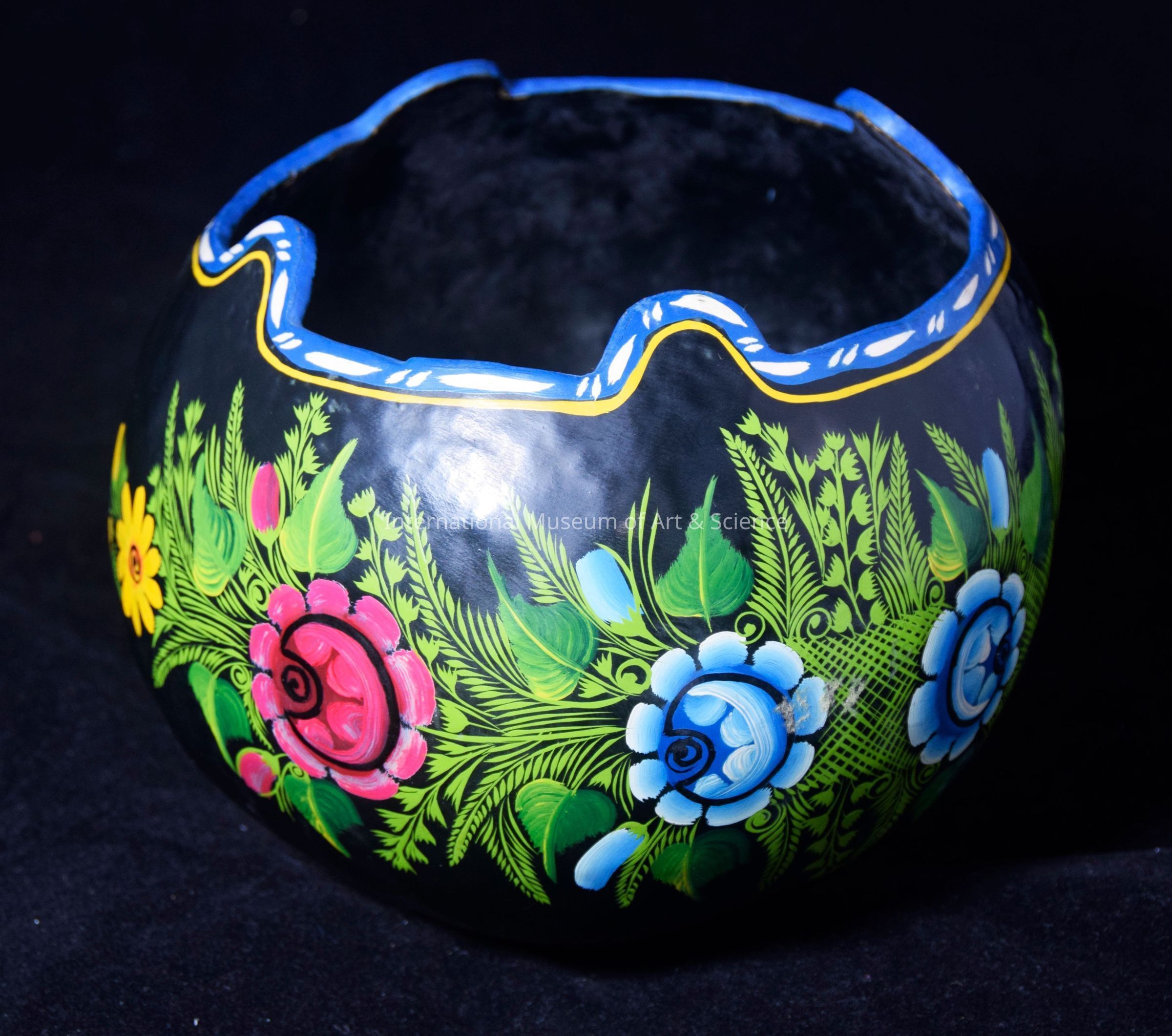 A gourd bowl with lid. The body is black lacquer with fine floral brushwork in a variety of colors.Artwork Details
