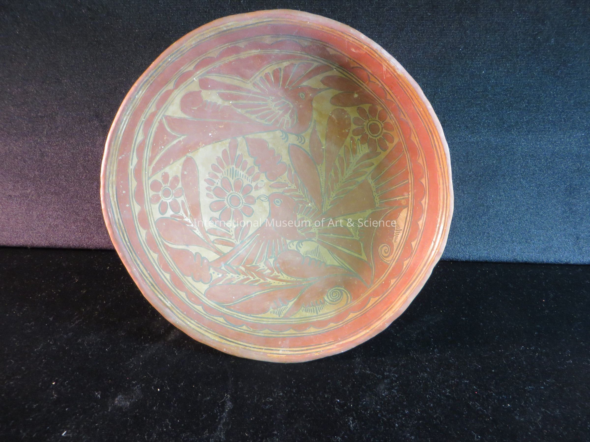 A clay tripod bowl. Floral and bird detailing on inside