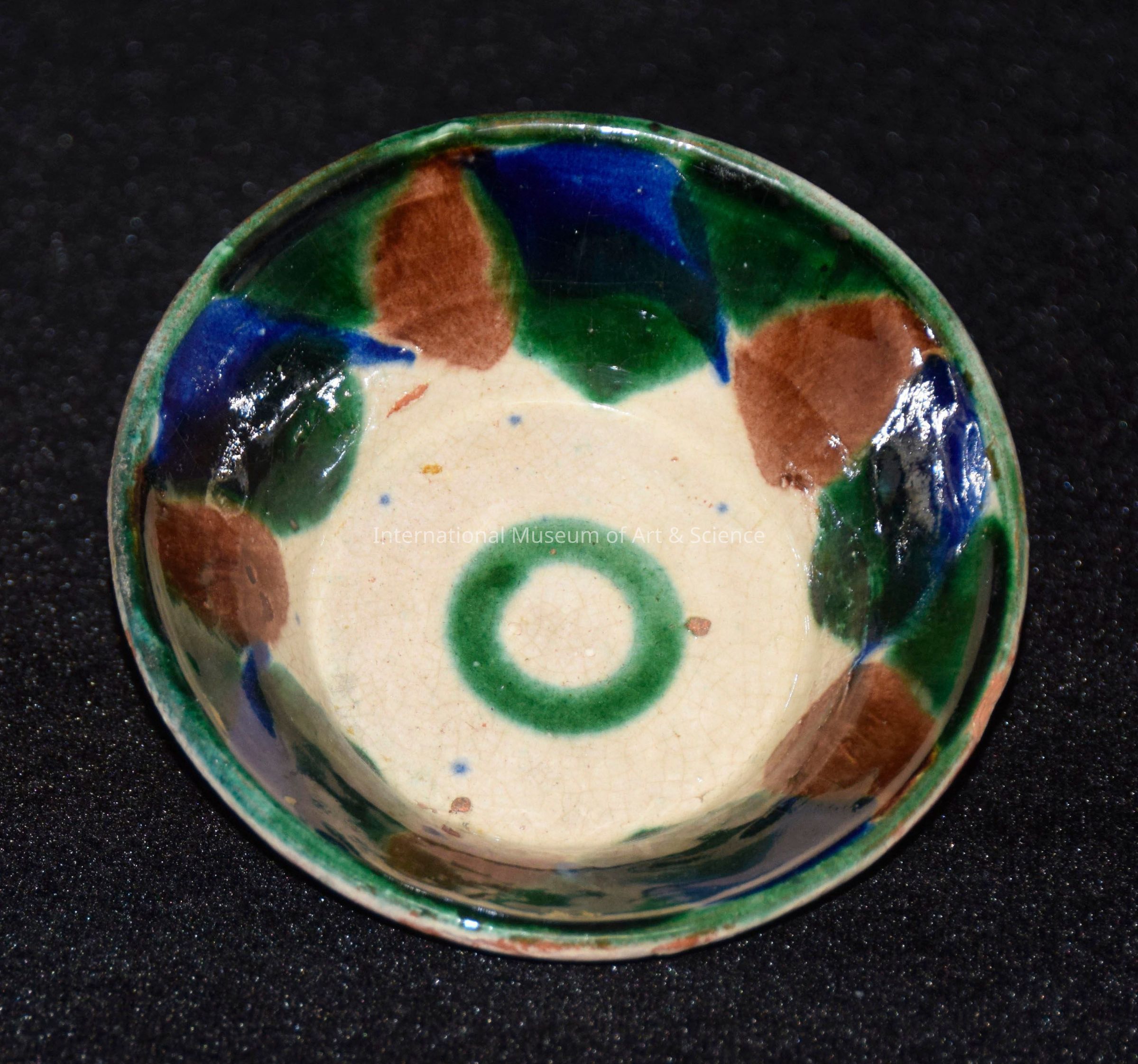 Cream background; interior with dark blue, green, brown and touches of black; dark green ring inside bottom center; glazed.