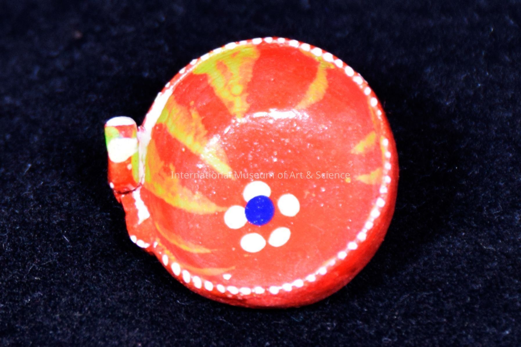 Bowl. One handle, orange, green and white floral design. Part of a set of five.