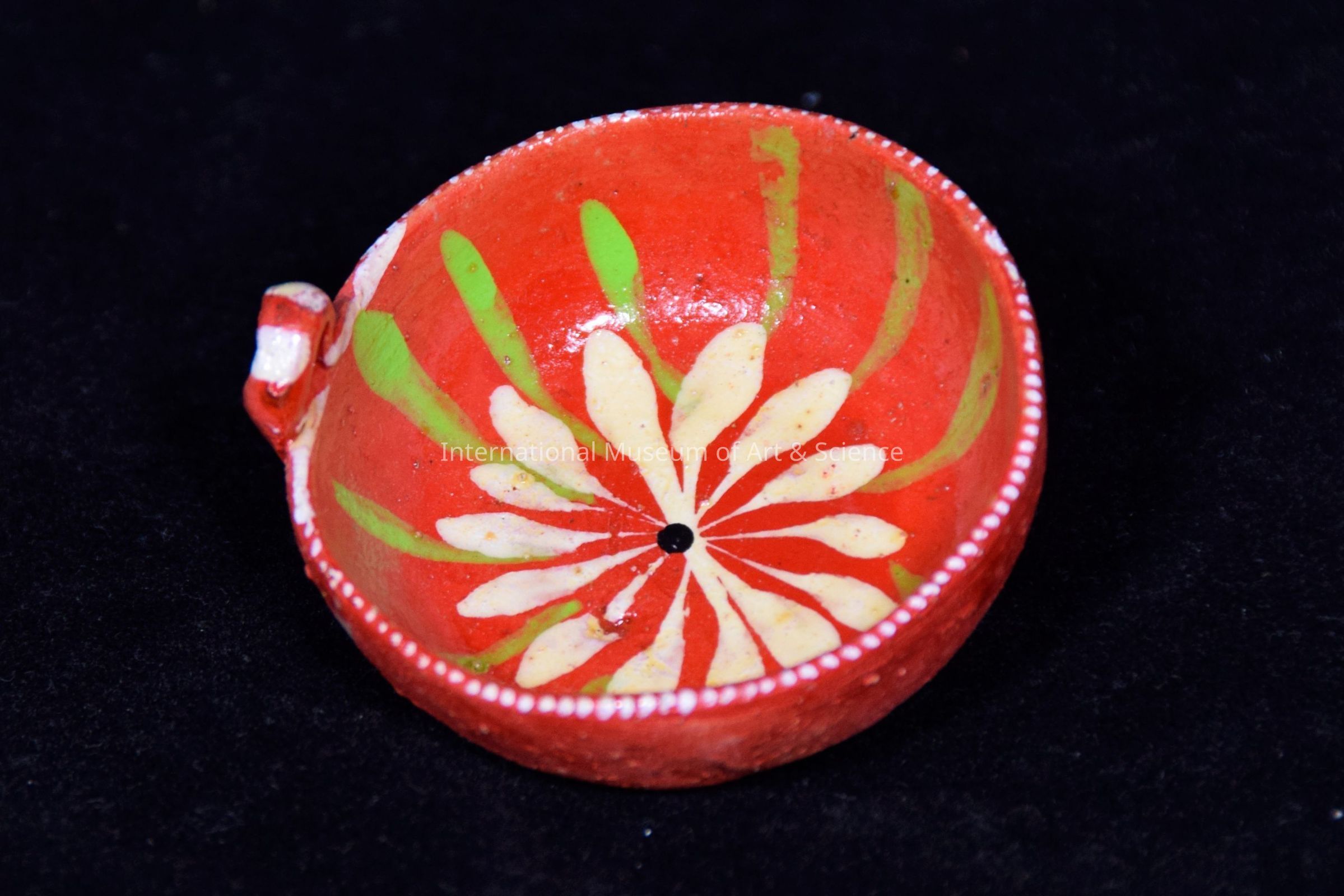 Bowl. One handle; orange, with white and green floral design. Is part of a set of five.