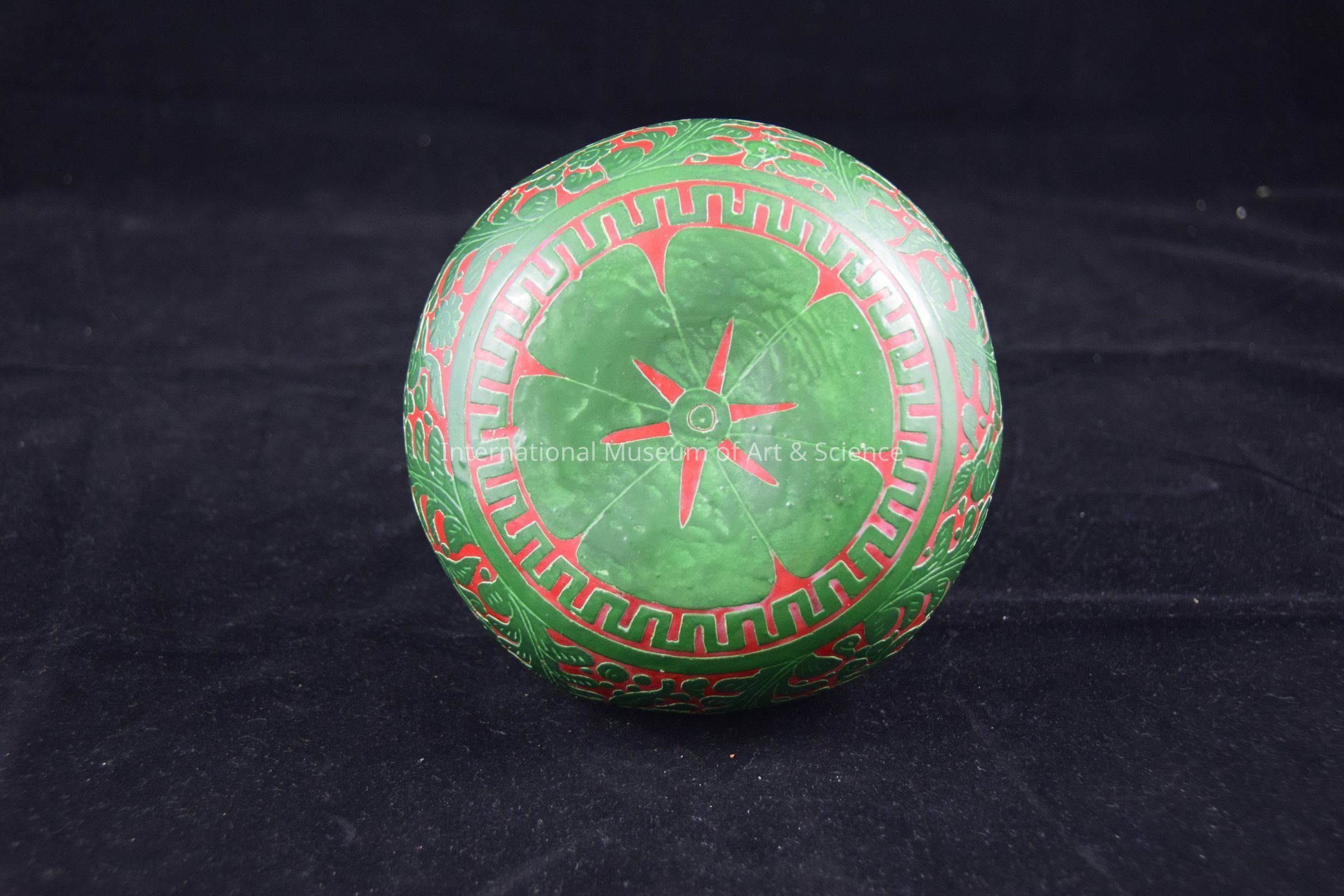 Bowl with Lid. Red inside bowl and lid; covered by dark green floral and animal motifs.Ethnography