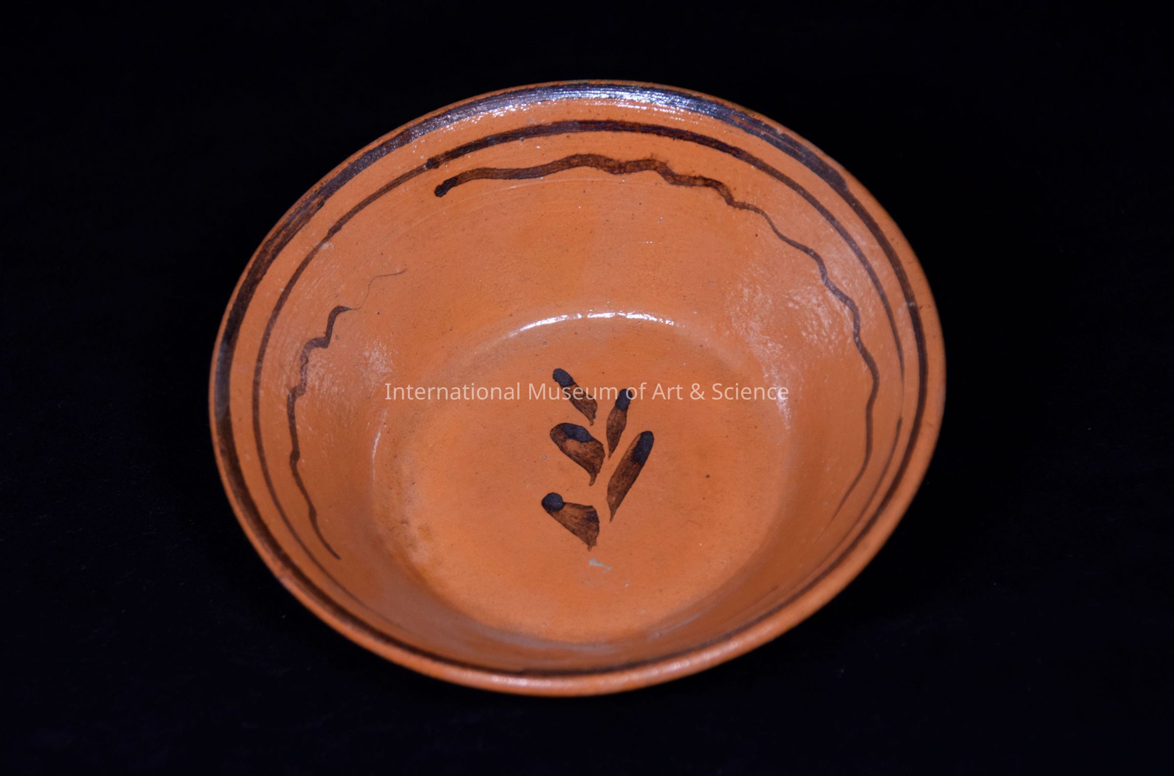 Bowl. Small shallow bowl of natural orange clay interior appears to be glazed with brown rim bands and curvilinear designs; central leaf design; exterior unglazed.Dimensions