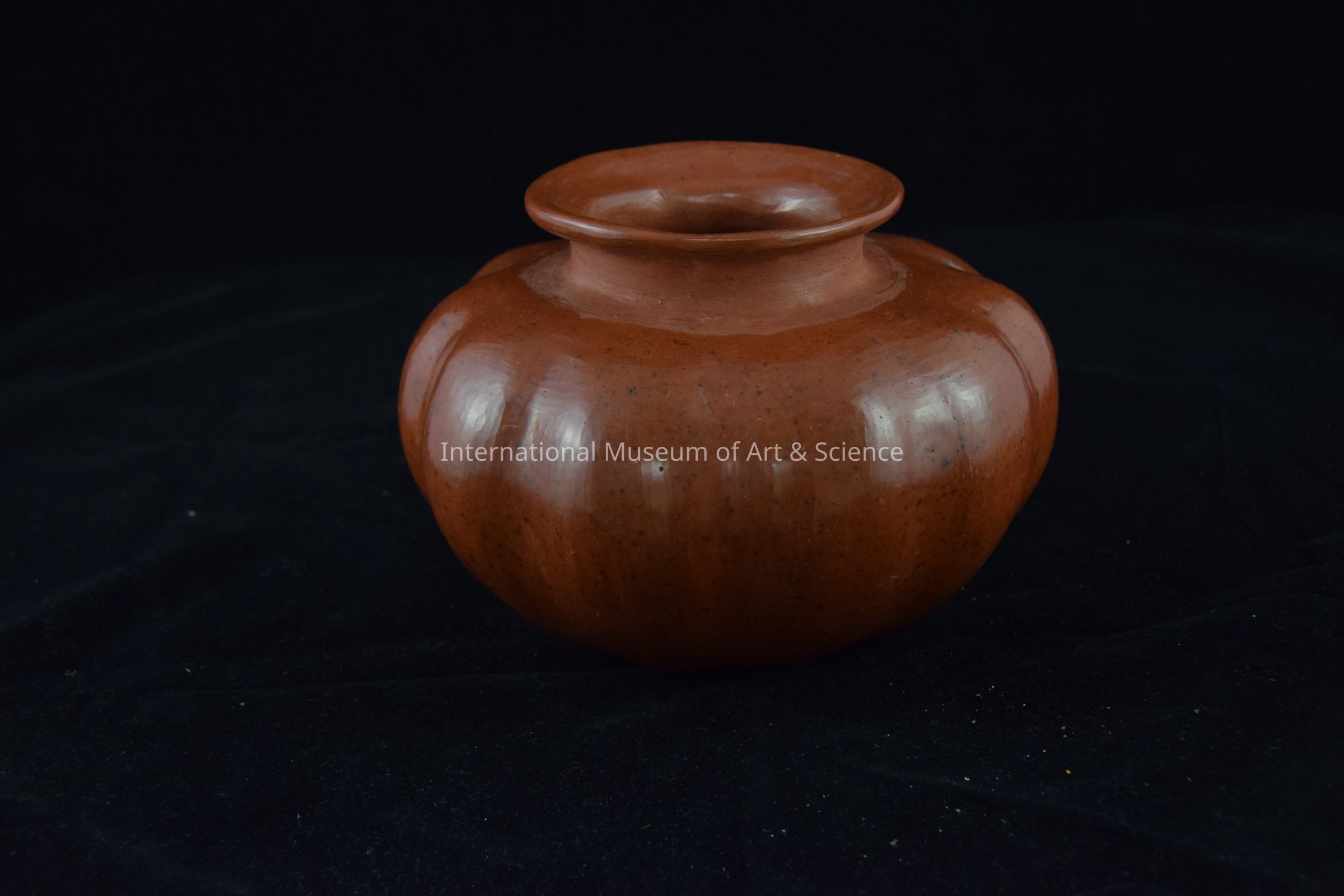 Pot. Mexico. Pottery, glaze. Ca. 1976. Pumpkin-shaped bowl; reddish-brown; black tiny spots under glaze; large round body; small mouth at top.