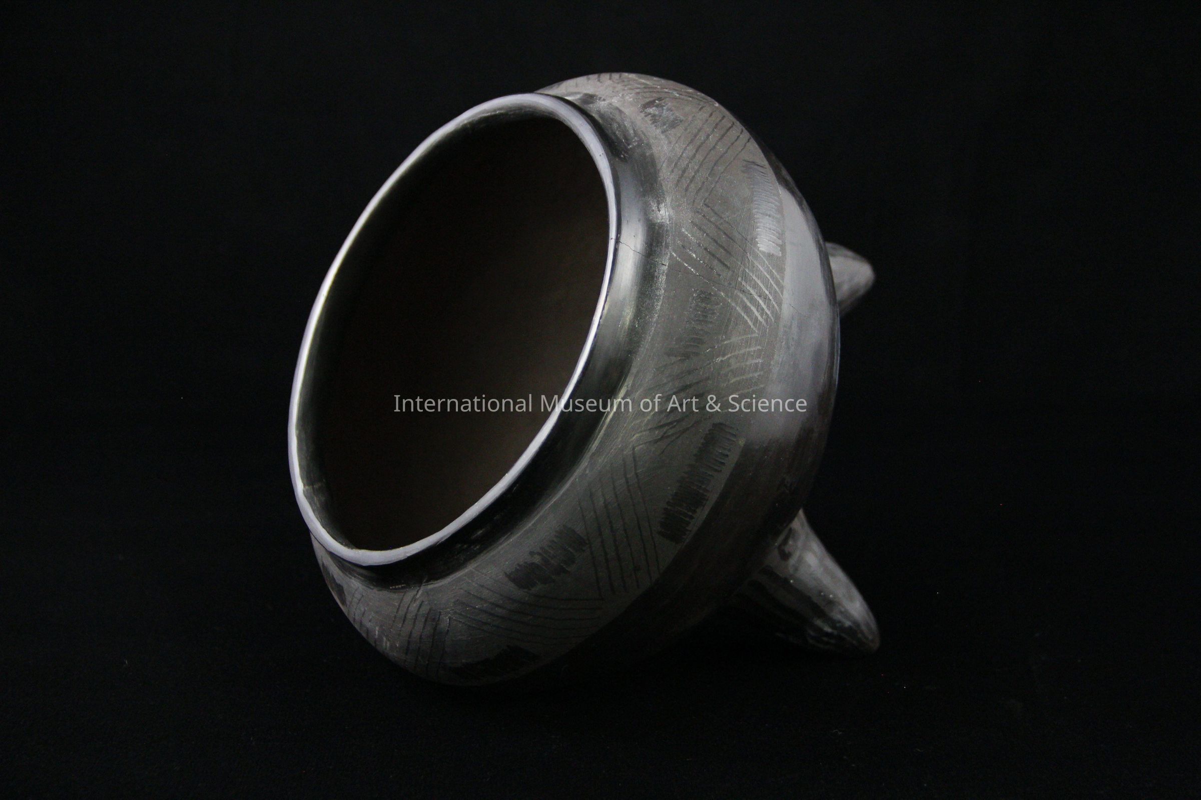 A tripod vessel. The bowl is made from black burnished clay. There are geometric designs near the rim of the bowl. The bowl has three feet, each having a hole bore through them.Dimensions