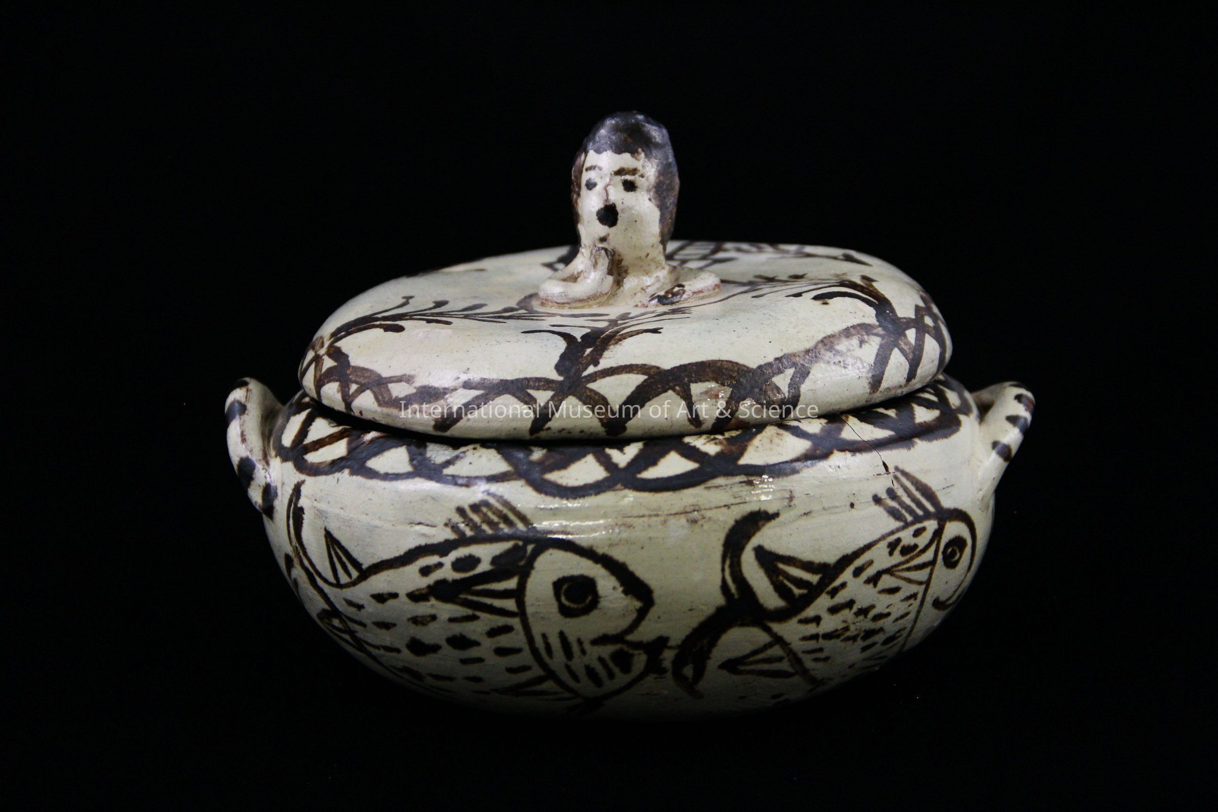 A bowl with lid. The bowl has a cream background, decorated body with brown fish, and brown curvilinear designs on top border. The interior of bowl has brown leaf motifs. It has looped handles with brown stripes.Dimensions