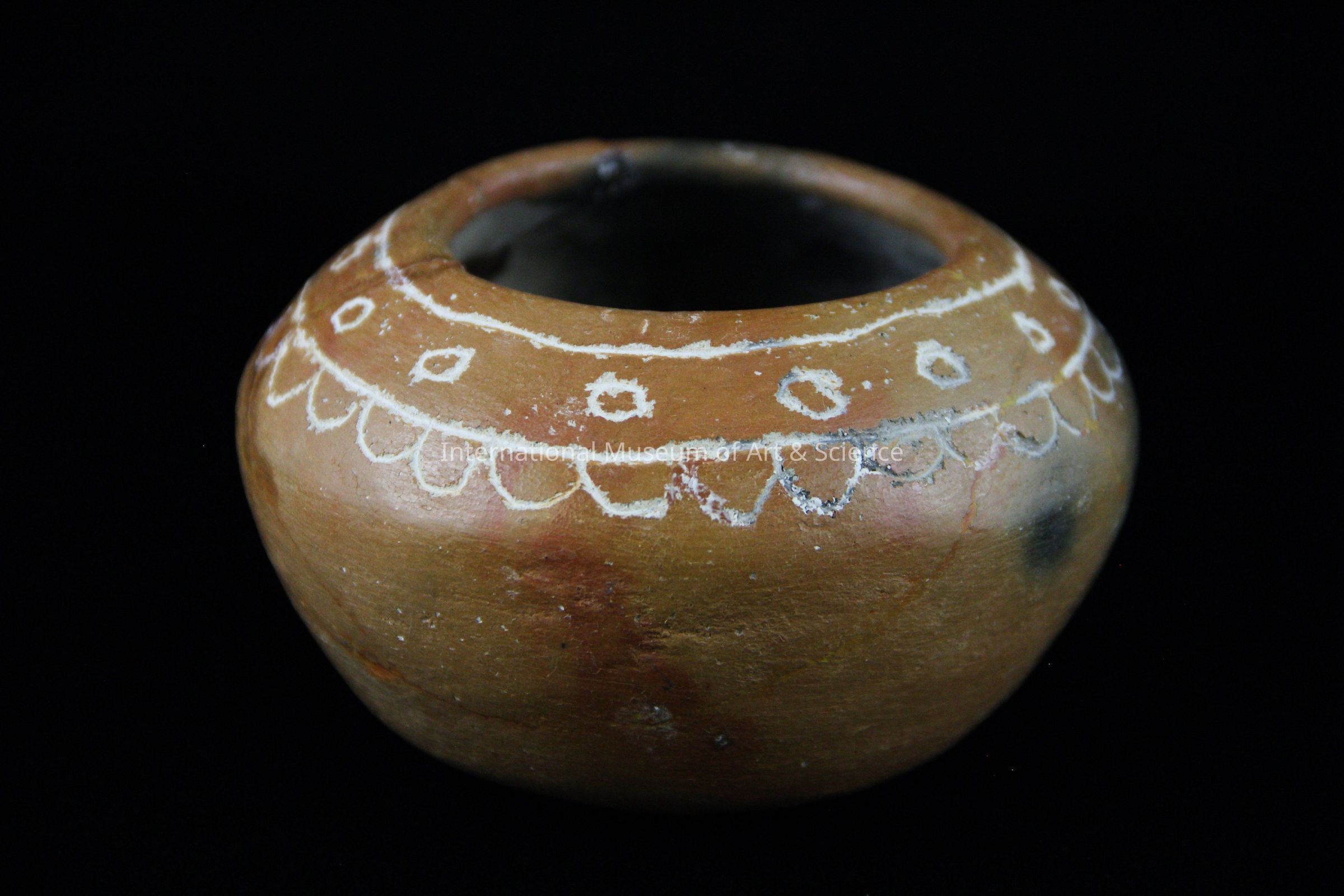 A small clay bowl. It is made from terracotta clay and has a carved scalloped edge colored in white around the rim. There are black fire spots on the interior and exterior of the bowl. It was damaged on arrival--see "condition" for info.Dimensions