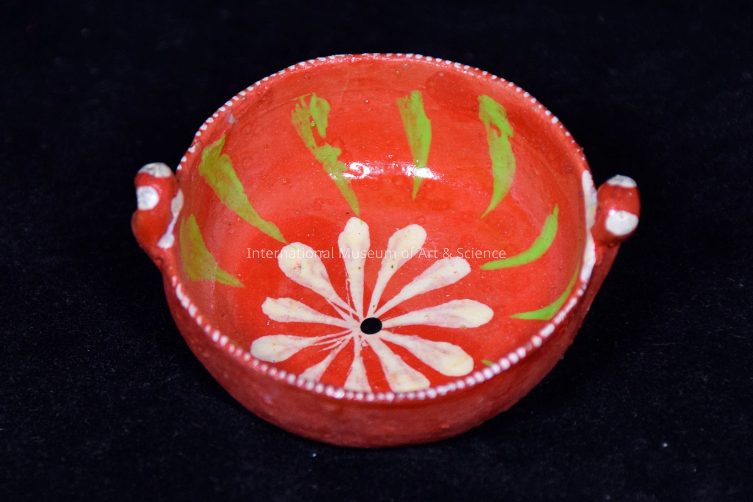 Dish. A deep miniature dish with two handles; orange. Is part of a set of 5.