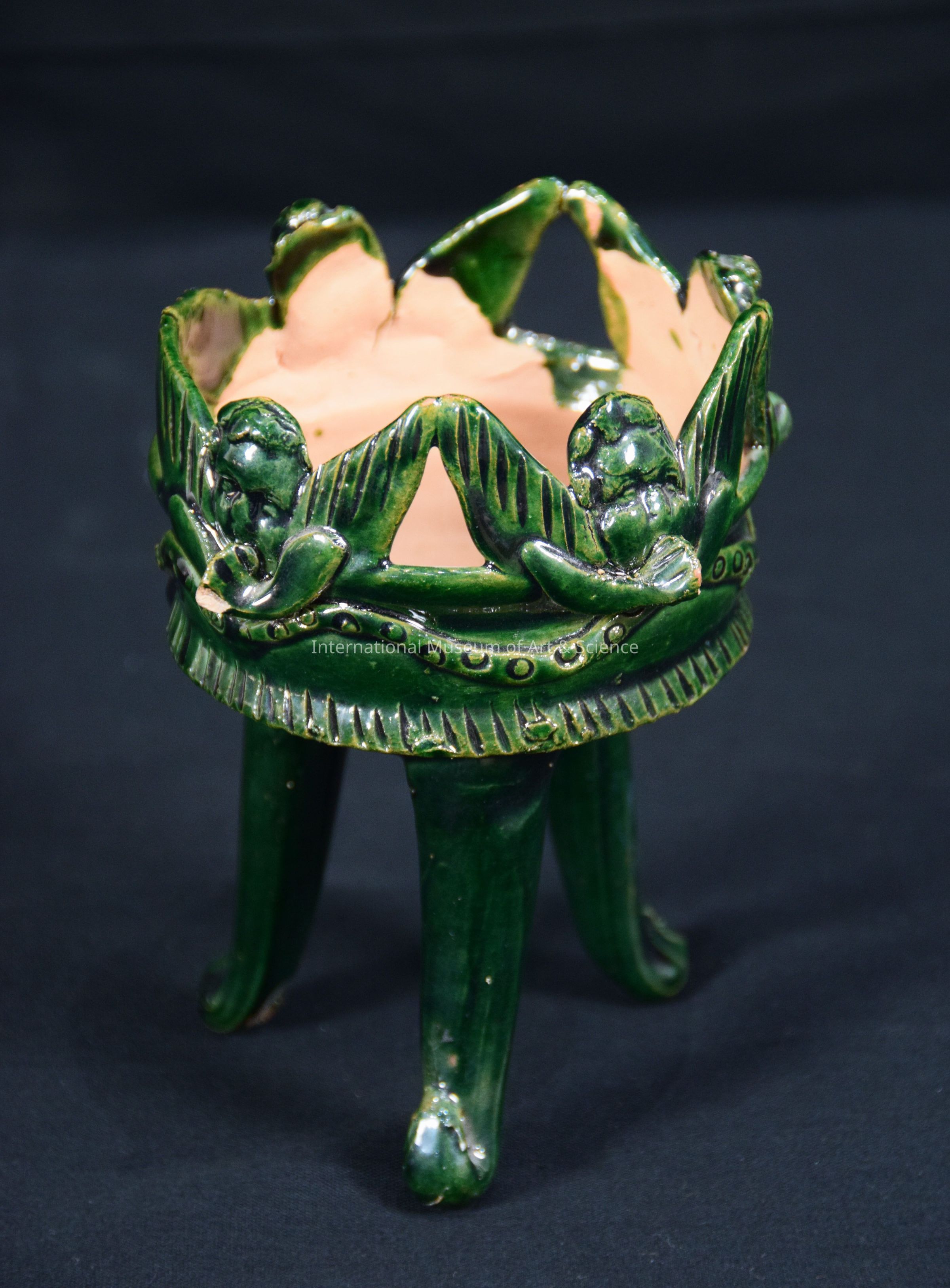 A ceramic tripod bowl. The round bowl is decorated with four sculpted angels. The interior of the bowl is unglazed. The piece is glazed in a dark green.Dimensions