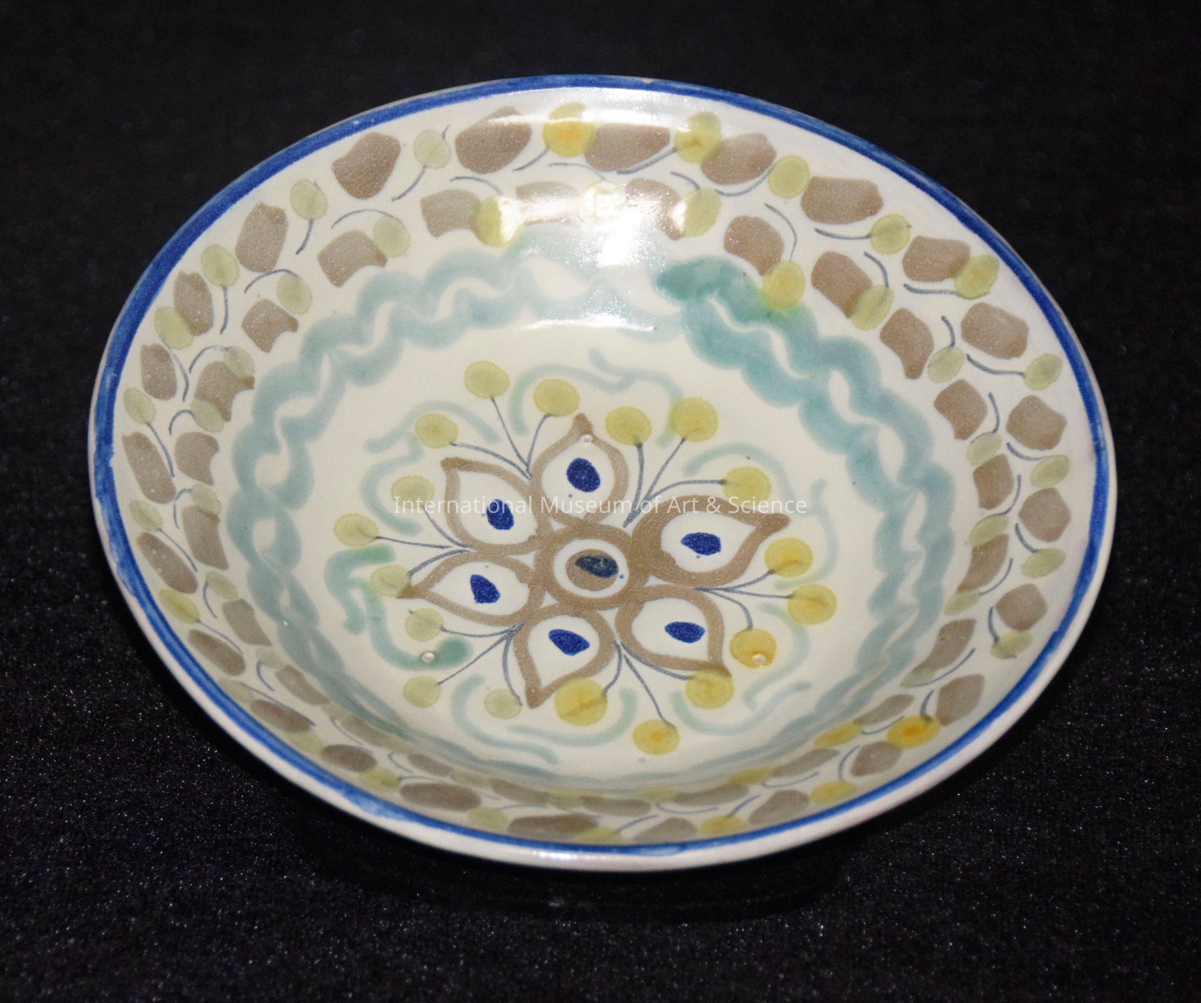A cermaic bowl with a cream background; dark blue border; large brown flower inside center with touches of dark blue surrounded by light green grooves, yellow circled flowers; brown patches.Dimensions