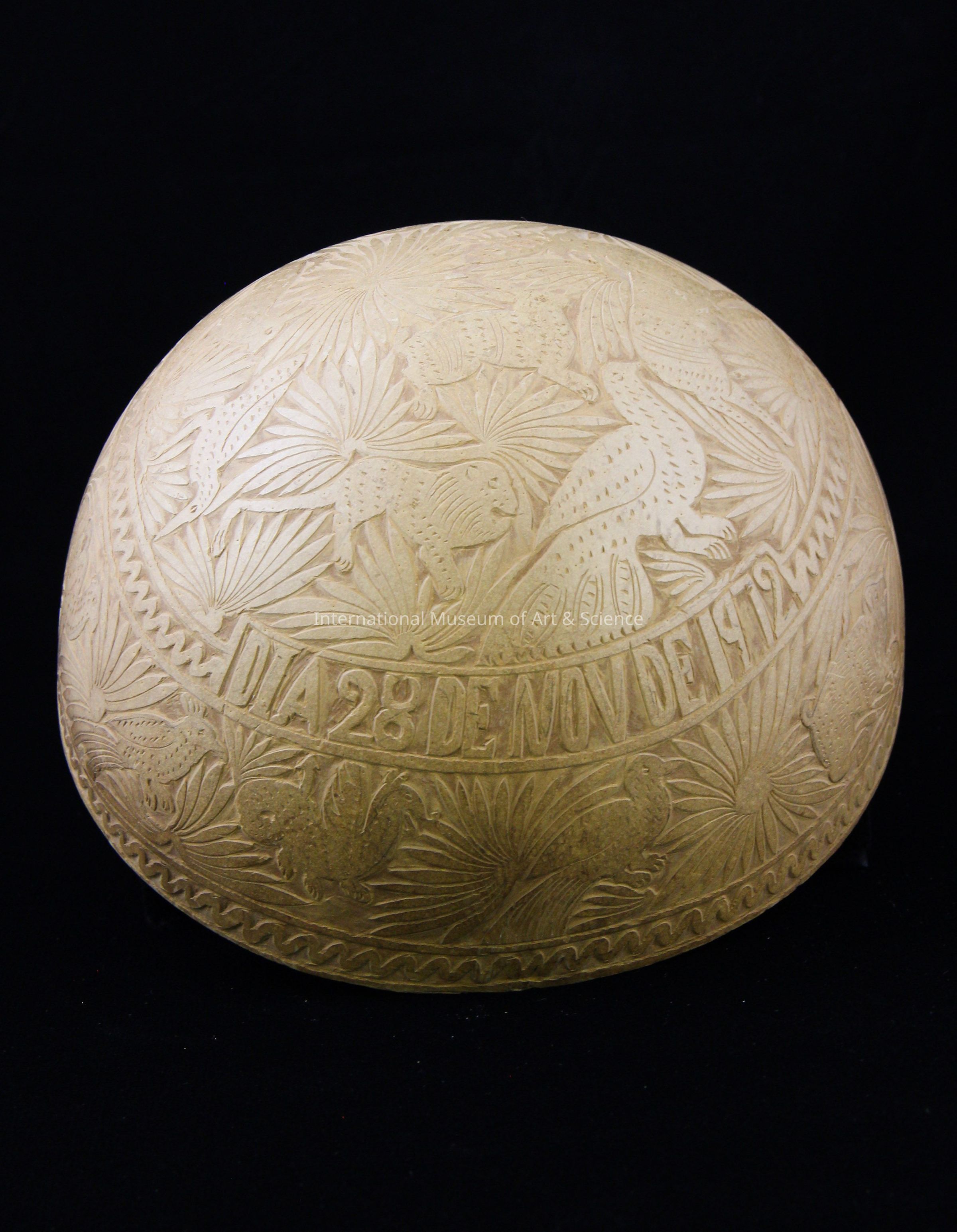 A carved gourd bowl. The bowl is carved in great detail with animals and plants. The bottom is labeled: "Dia28NOVde1972."