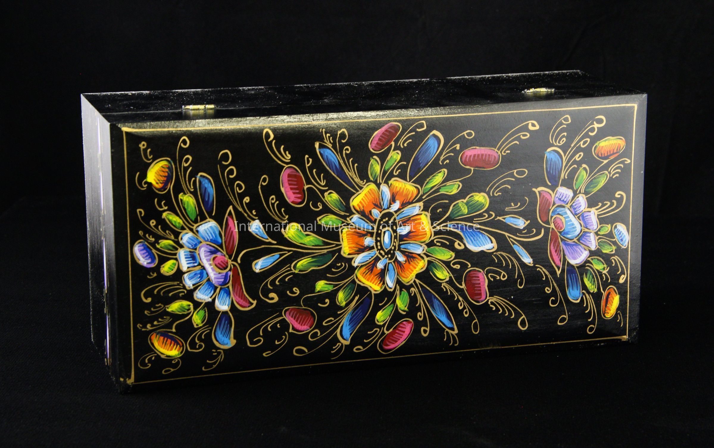 A wooden box with a hinged lid. The box is made from Pine. The box and lid are rectangular in shape. The overall exterior is painted black with the top cover elaborately decorated with multi-color floral motifs in light purple, magenta and yellow-orange. There are bronze leaf designs surrounding the floral motif. The interior of the box is unfinished. The box is lacquered to give it a glossy finish. There are two metal hinges that hold the lid to the box.