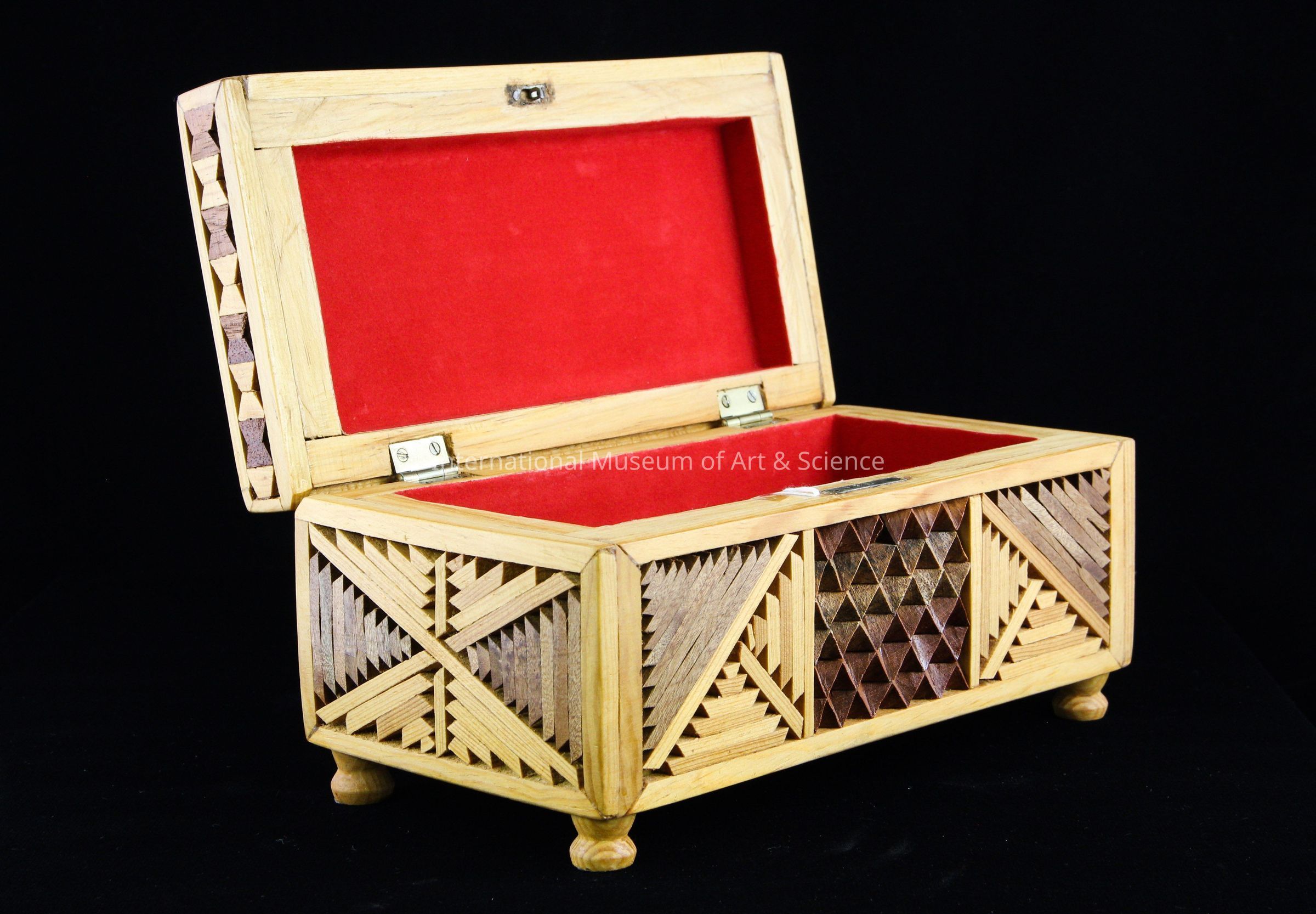A wooden box with a hinged lid. The box is carved from wood with multiple kinds of wood added to created decoration. The interior of the box is lined with a red fabric.