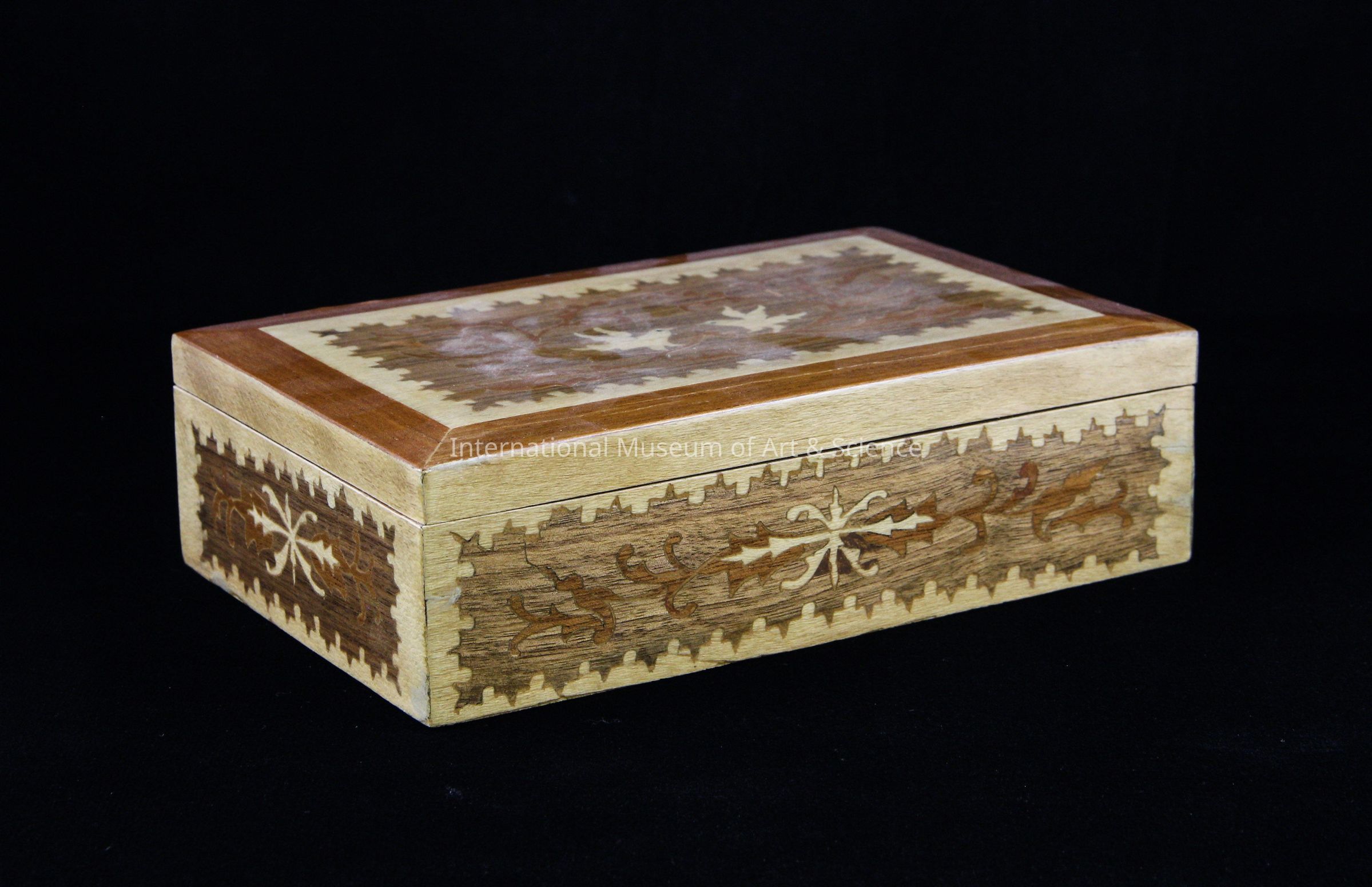 A wooden box with a hinged lid. The box has carved details which include birds and patterns. The box is stained different colors to make the carvings stand out.Artwork Details