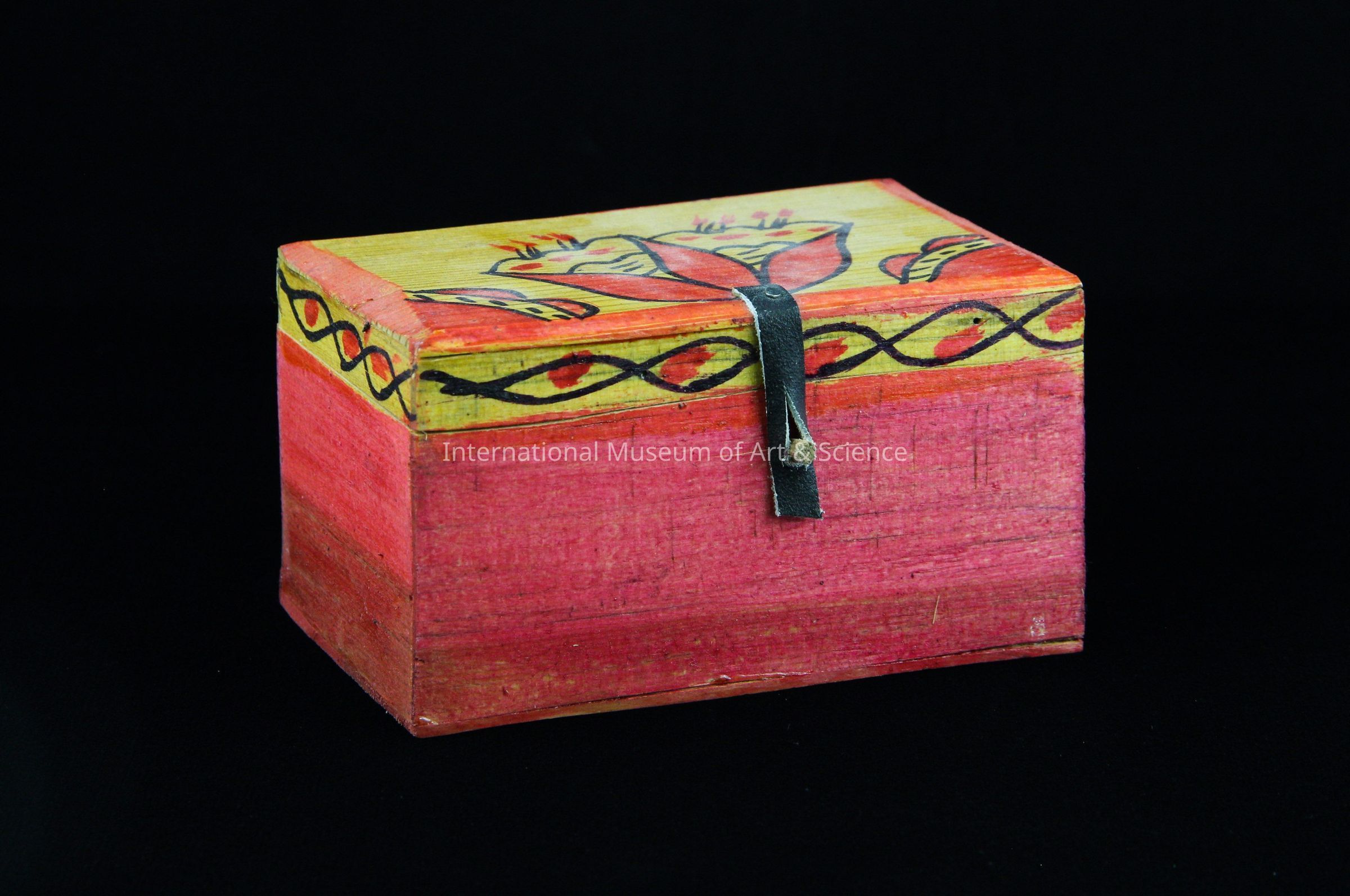 A wooden box with a hinged lid. The box and lid are rectangular in shape. The lid is stained yellow with a red and black design around the edge and flowers in ther top center. The box itself is stained red/pink. The closure on the box is a leather strap with a hole on th elid that fits over a nail on the box.Artwork Details