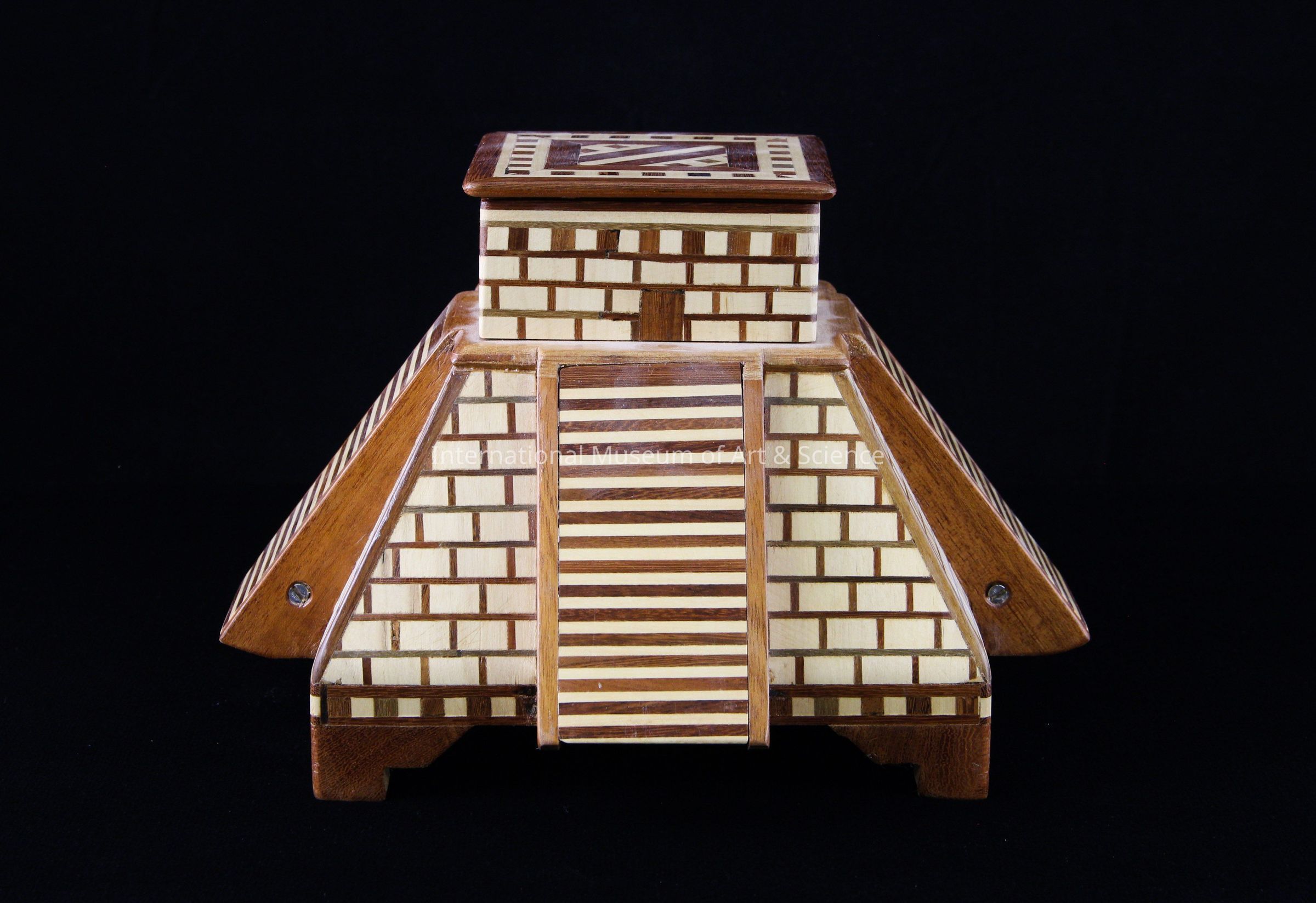 A woodden cigarette box in the shape of a pyramid. The pyramid box is inlaid assorted woods, has four feet, with the outside walls forming the four triangles that meet in a square at the top. There is an inner compartment at the top. There are also rectangular slots with stripes attached to the side, the slots open and close, and can slo hold cigarette boxes. The top is flat, and when opened the inner compartment rises.Dimensions