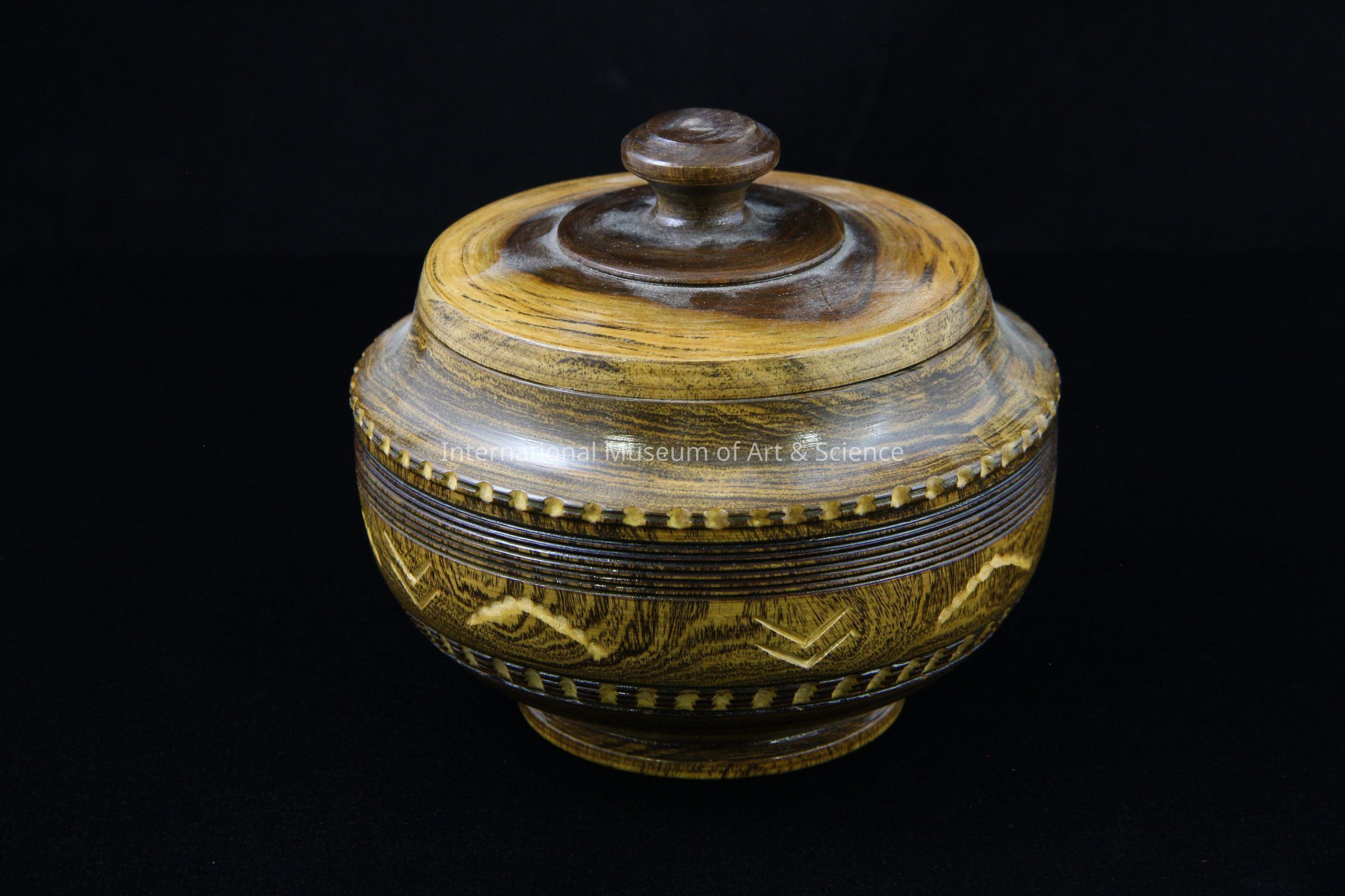 A wood carved trinket box with a matching lid. The piece was turned with a machine. The box has lines carved into it with machine, along with crescent shapes and chevron motifs carved with hand tools.Made/Created