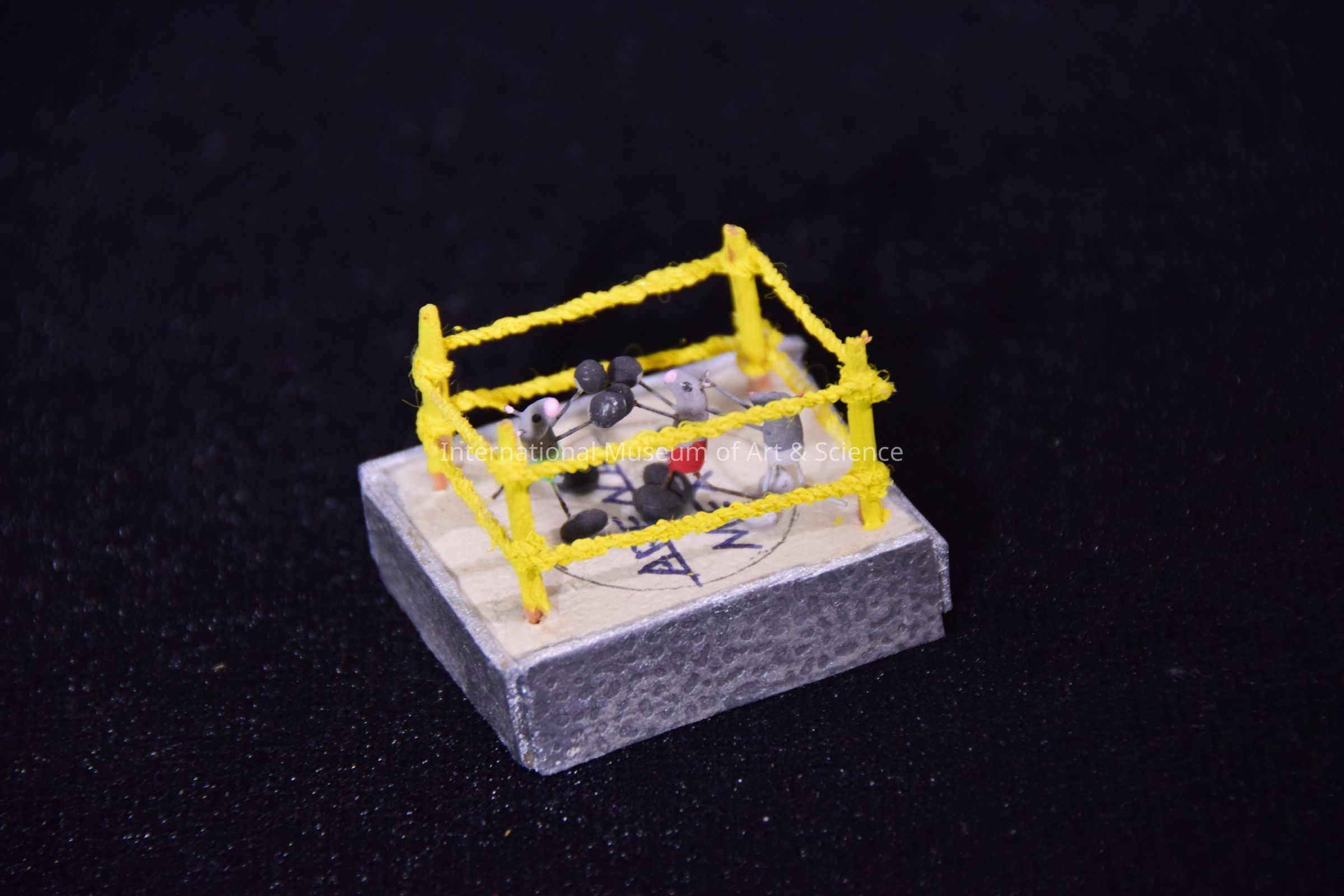 Miniature mice boxing. Silver rectangular shaped cardboard box as an arena; yellow fiber ropes and wooden poles; inside arena are three clay mice-one wearing green trunks, other with red trunks and third white trunks as a referee; black clay gloves and boots on fighters; referee has white clay boots; wire ears, hands and legs.Artwork Details