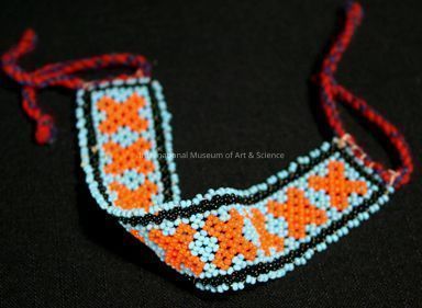 Orange crosses on light blue background with thin black border; both ends have red & blue yarn to fasten bracelet around wrist.