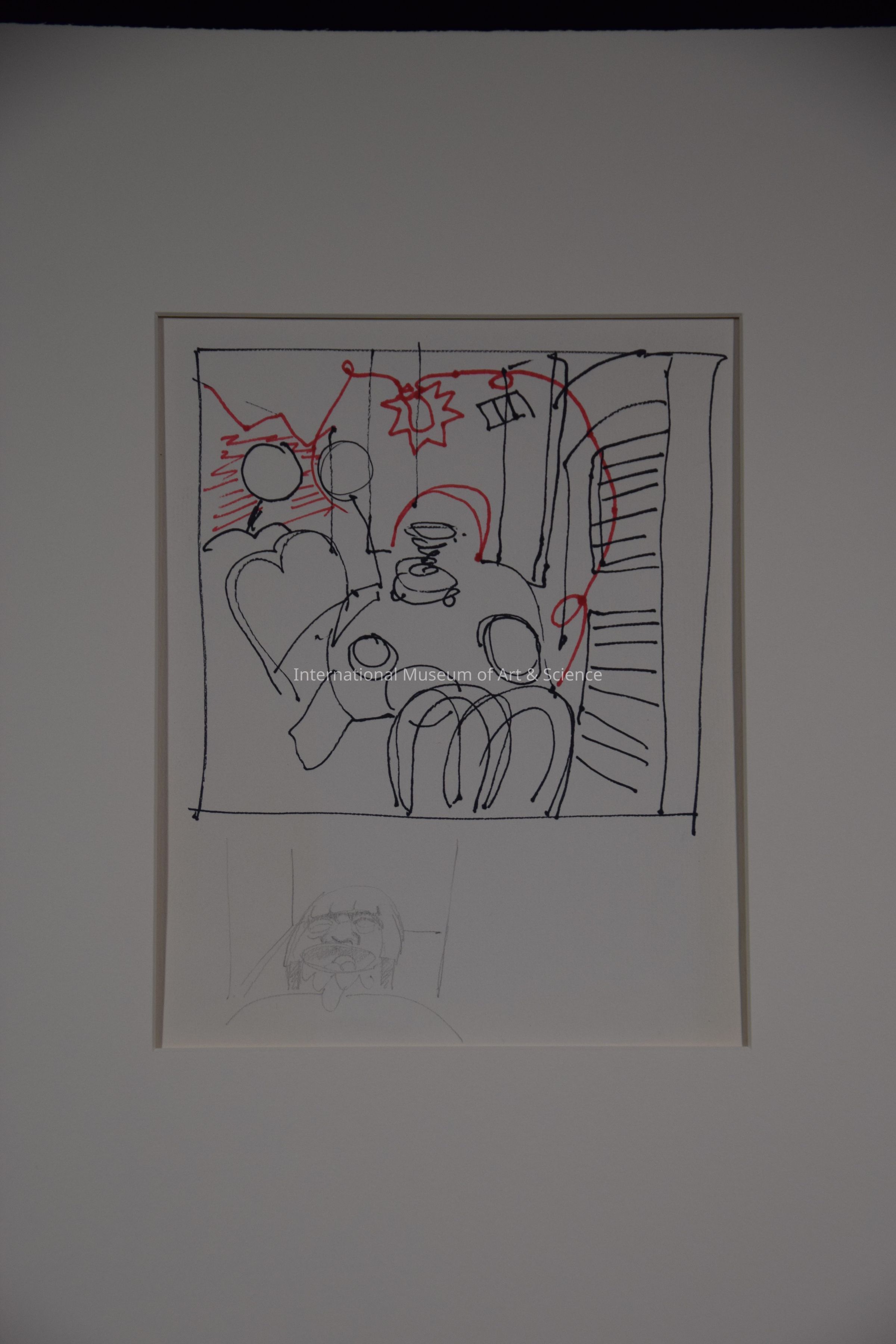 "Breakfast in Oaxaca" 1975. Preliminary drawing on Paper; red markings indicate a light bulb at center with electrical cords black drawing depict chairs, table, and wooden doors in a dining room, bottom pencil drawing depicts a face with a vessel in front. See final piece: 1975.16.001Artwork Details