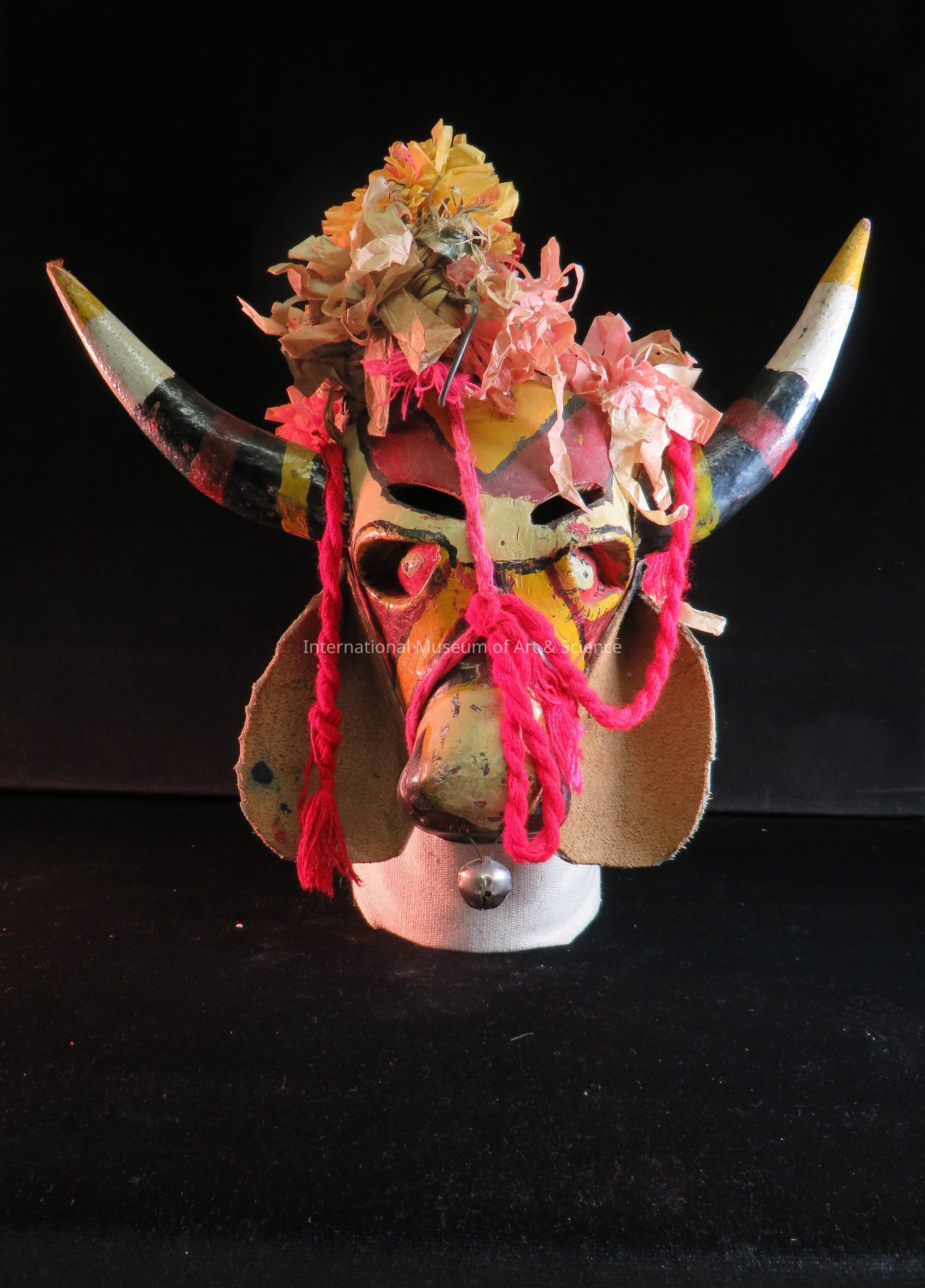 Bull mask. Red, yellow, black striped horns, bell at nostril, painted leather ears, arched headdress base of straw with colored paper flowers.Artwork Details
