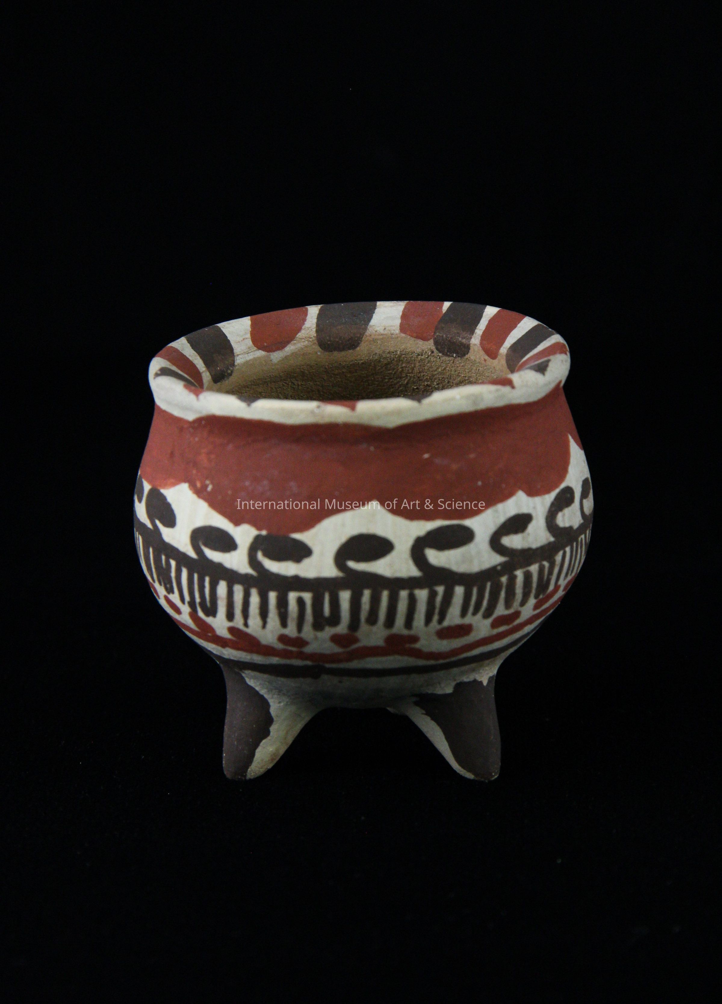 A small ceramic incense burner. The piece has a globular body and tripod legs. The piece is painted a dark brown with white and burnt red designs.Dimensions