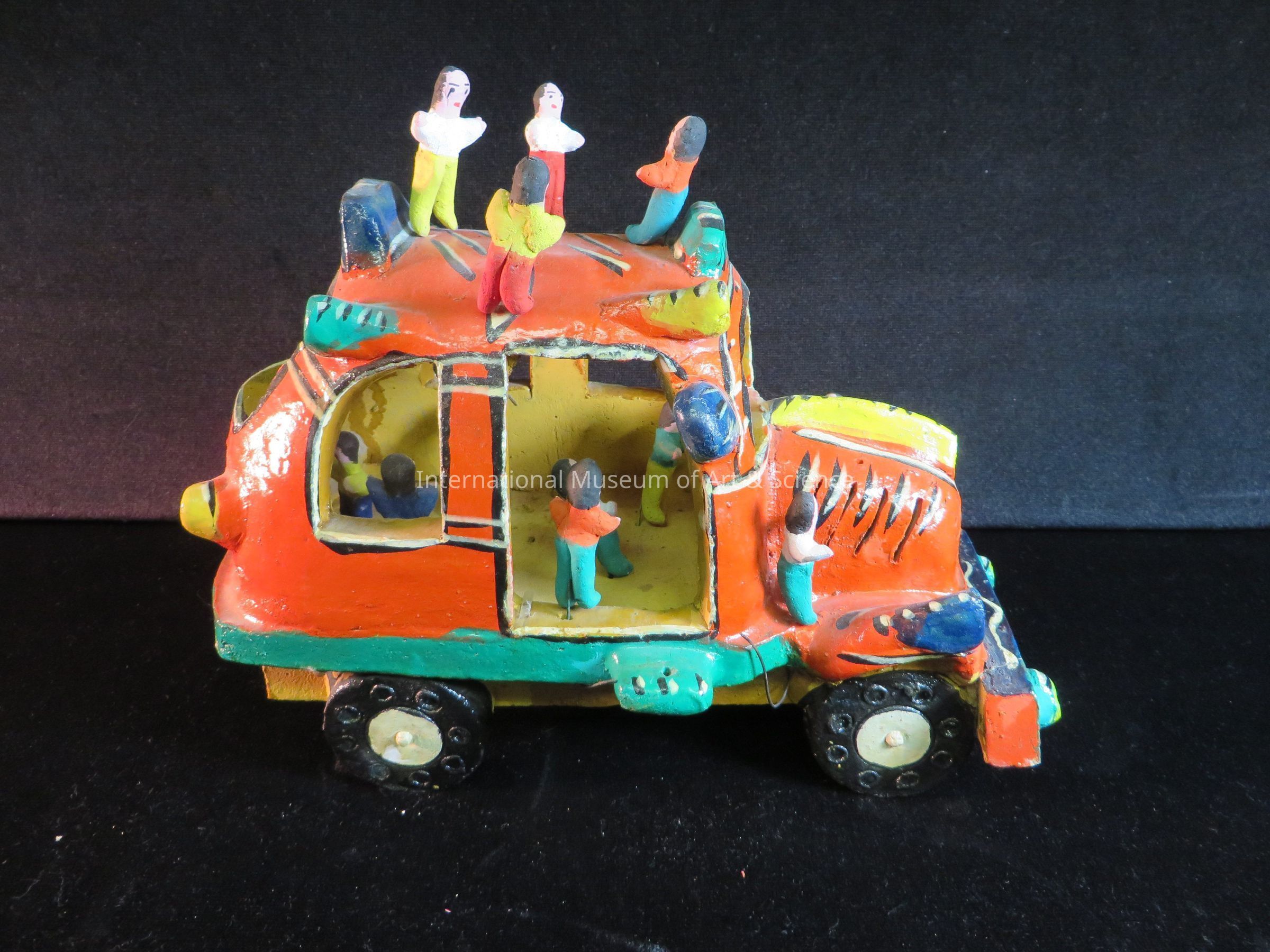 Red-orange bus with carved window, door and windshield openings; bus filled with 12 miniature clay figures on wires; miniature figures inside and outside on the truck; green roof sign "MEXICO" ; green borders with front ubmper and yellow headlights; scattered black and white stripes on bus; black and white clay tires; mustard color interior.