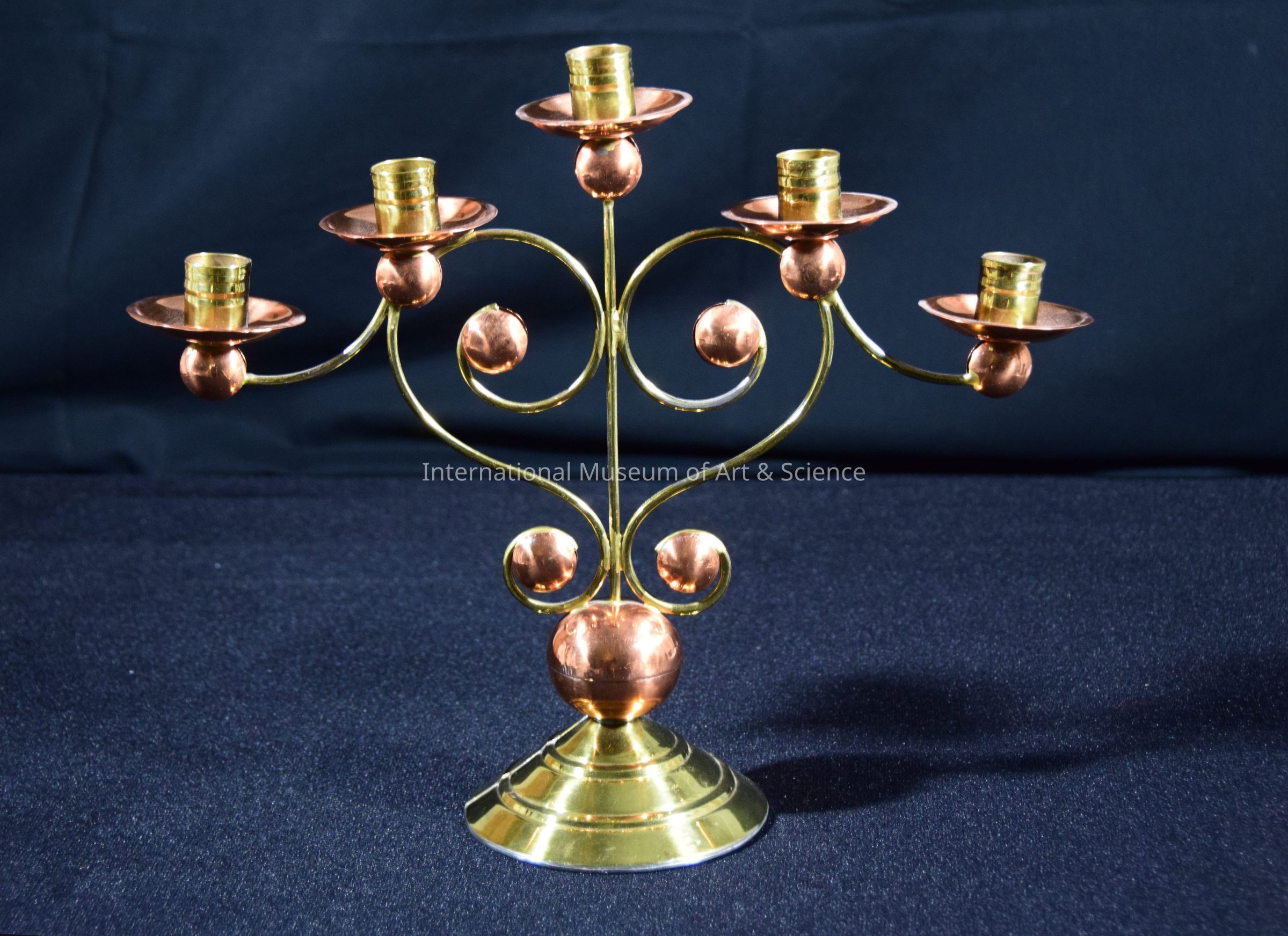 A brass and copper candelabrum. It has a brass repousse cone at the base. A brass curlicue rods with copper hemispheres, copper soldered trays, slightly flanged for candle holders on top, and a large copper globe above coned base. There is sand inside the coned base.Artwork Details