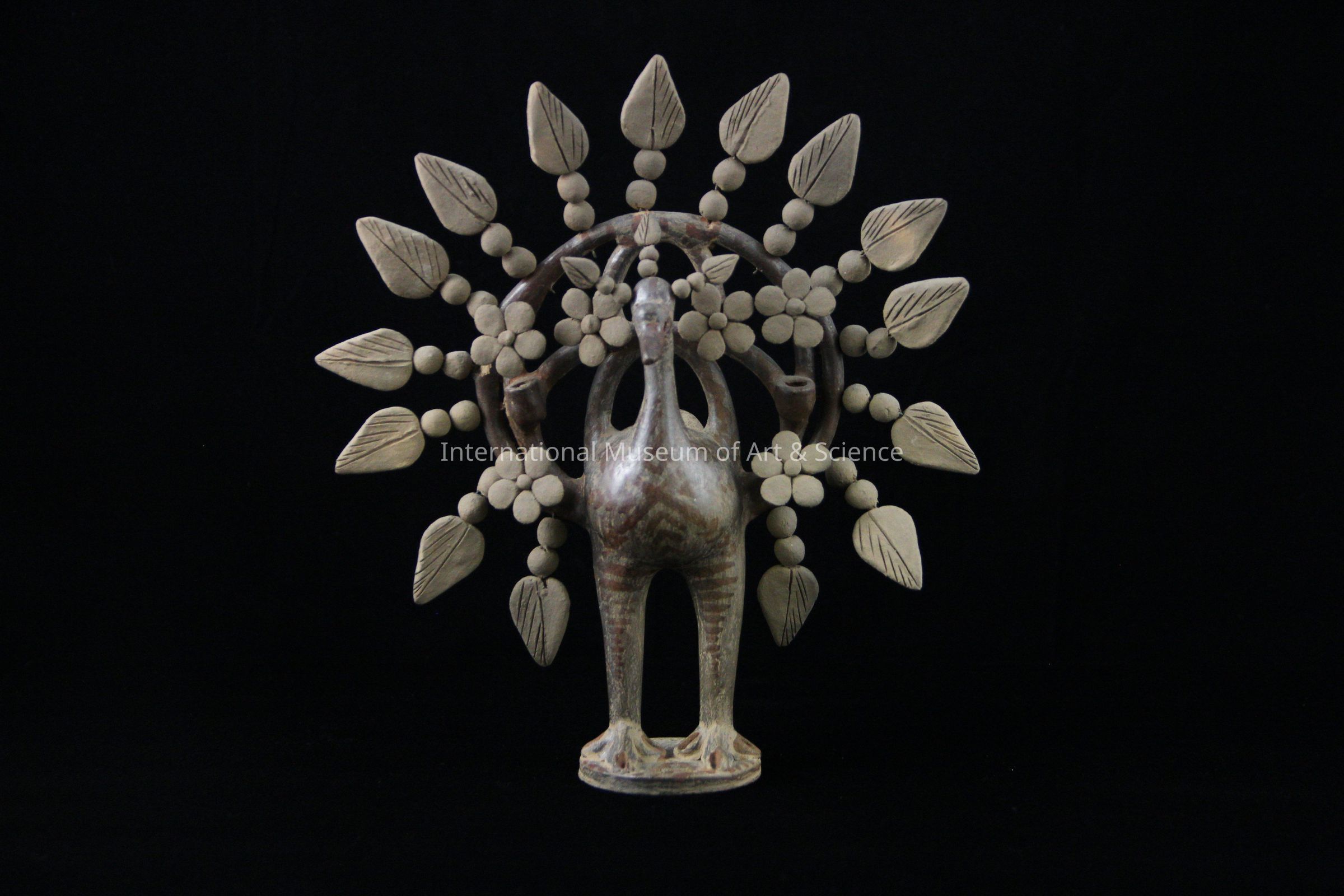 A ceramic candelabra, or candlestick. The candlestick is in the shape of a peacock. Its body is decorated with brown linear designs, there are clay leaves and flowers in spherical form, and leaves, flowers, and clay balls attached with wires as the wings of the bird. There are two candleholder areas in the wings. It stands on a small round base. The clay has a burnished surface.Made/Created