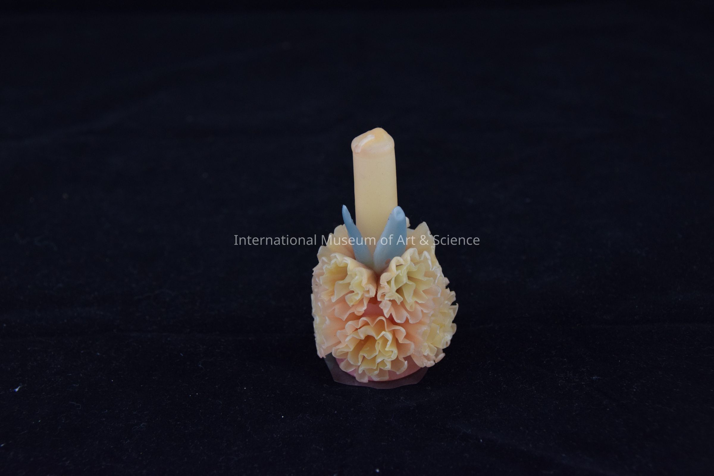 Yellow/off-white candle with decorative wax flowers around base. Base stuck to clear plastic circle.
