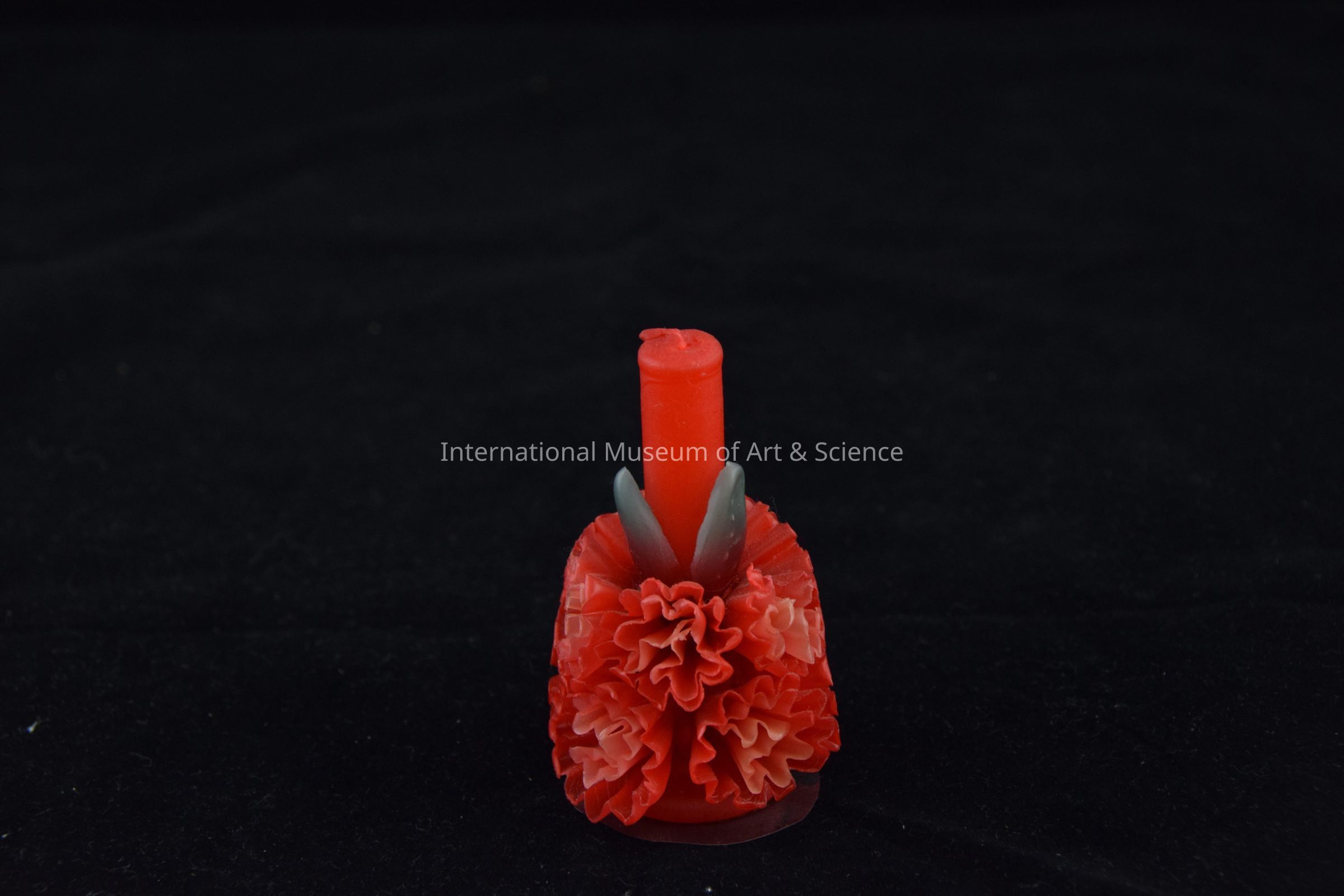 Red candle with decorative wax flowers around base. Base stuck to clear plastic circle.
