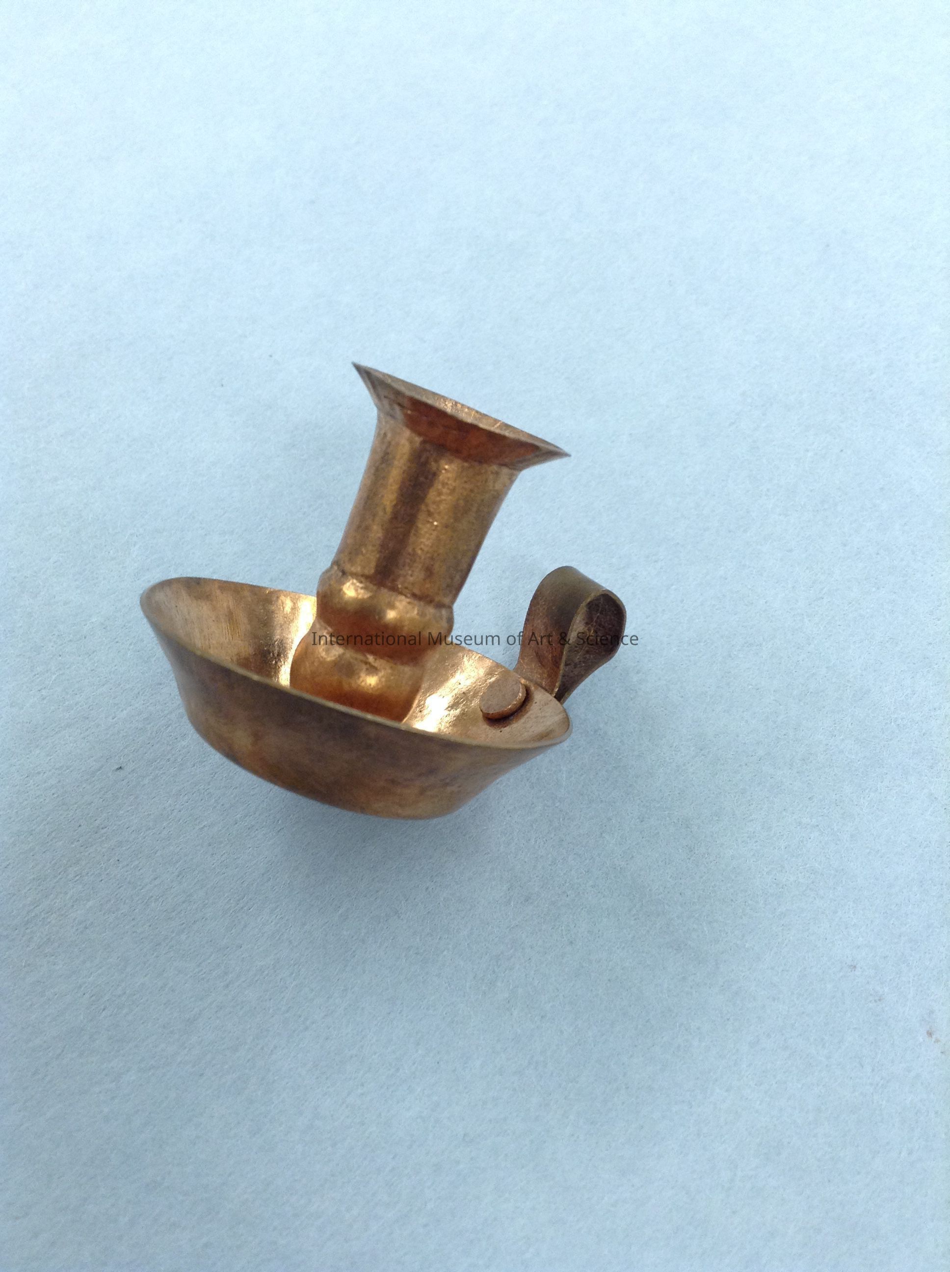 A miniature candlestick. It has a flanged base, hollow elongated cylinder socket at center and small handle attached. It is part of a 14 piece kitchenware set.Dimensions