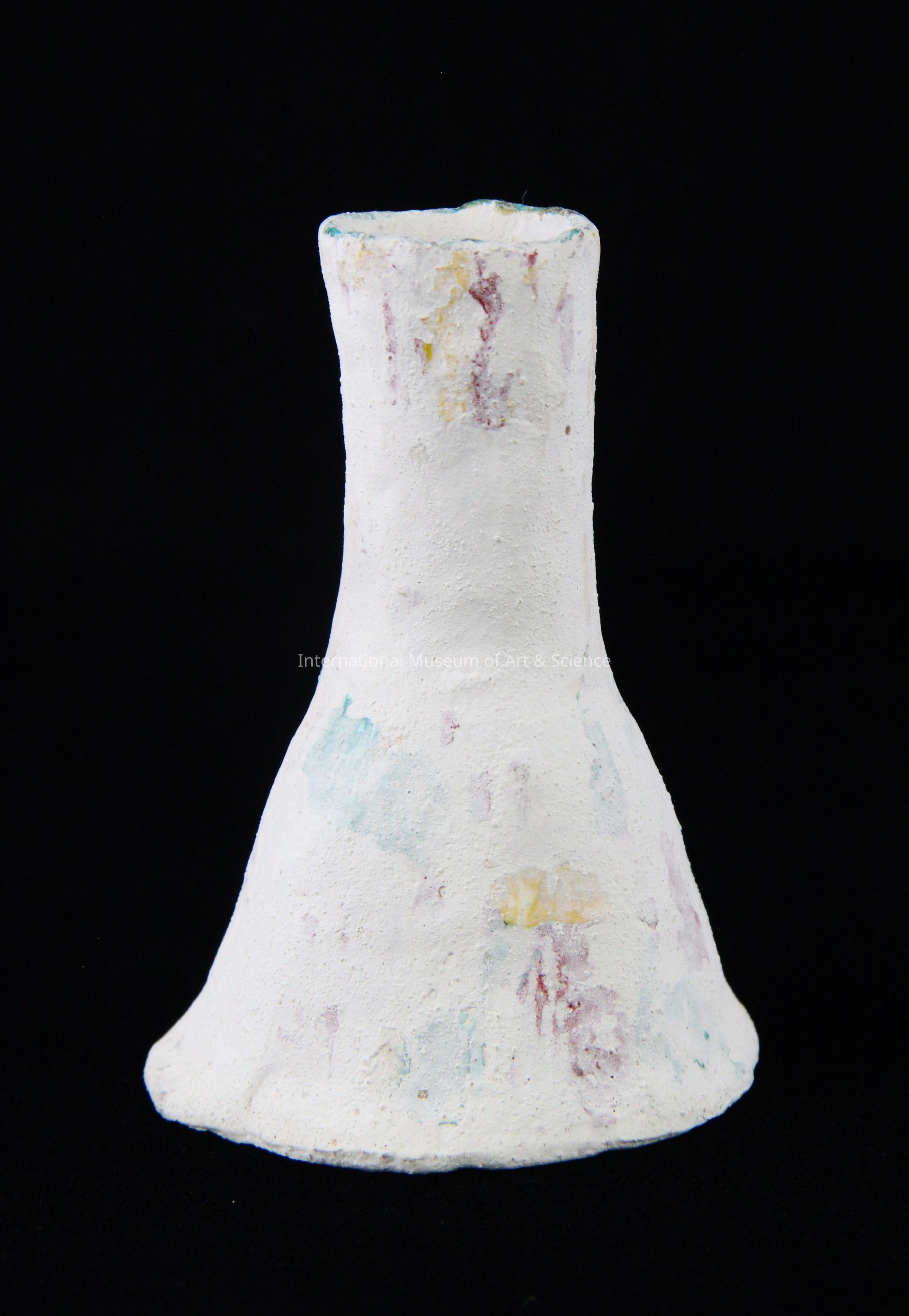 A small ceramic candleholder. The candlestick is hand built from clay. it has been painted white, but red, green, and yellow colors can be seen under the white. The piece is unfired. it has a short neck, with a round mouth, and a cone-shaped body.Artwork Details