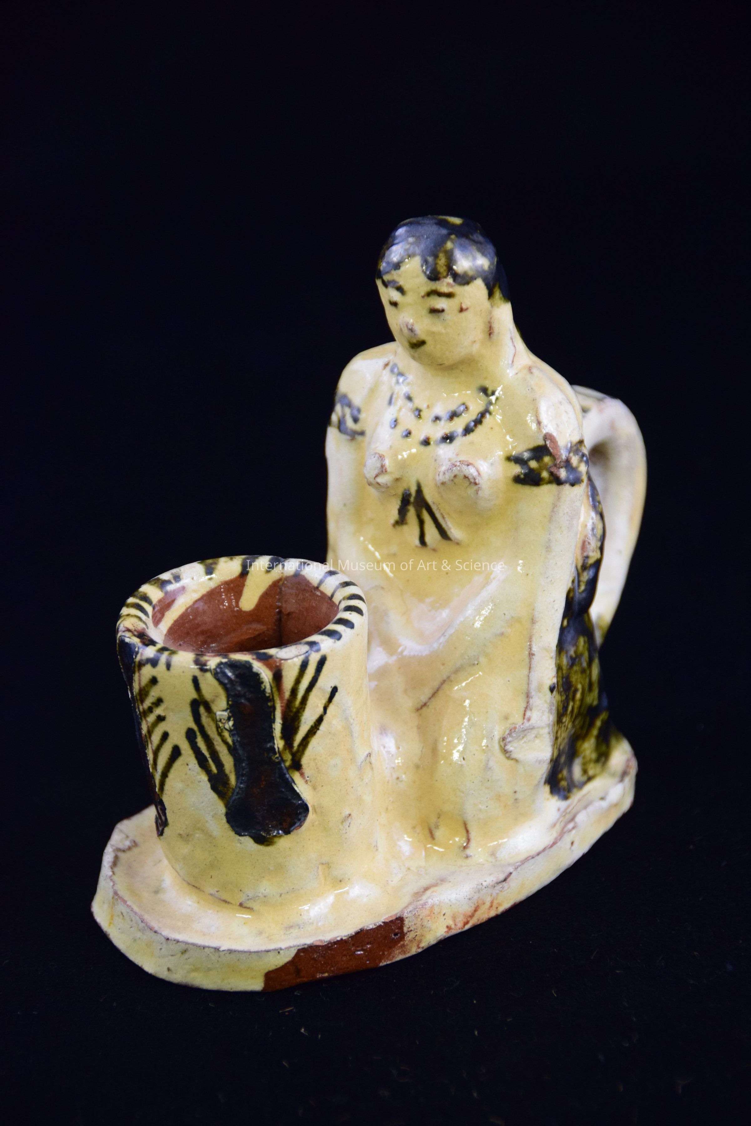A ceramic candlestick. The candlestick depicts a woman kneeling in front of a large bowl which has plants painted on the outside. This large bowl is where the candle sits. On the woman's back is where the handle for the candlestick is attached. The figurine of the woman is detailed with glaze, showing her braids, details on her dress, two necklaces, and the shawl on her back.Dimensions