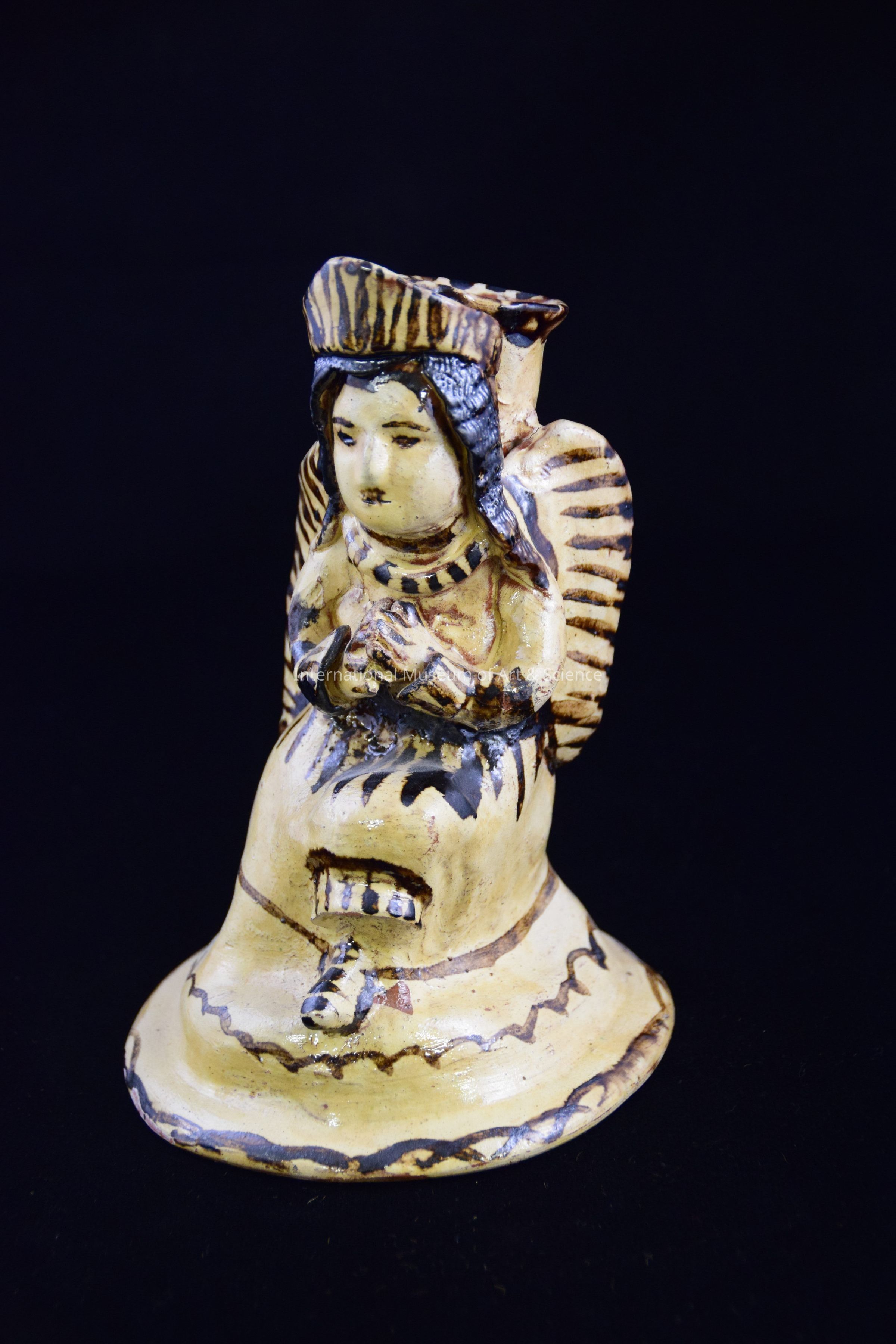 A ceramic candlestick in the shape of an angel. The angel is shown kneeling on a small platform with a pack on their back that holds the candle. On the angel's back is also a handle to hold the candlestick by. The angel has its hands folder on its chest.Dimensions