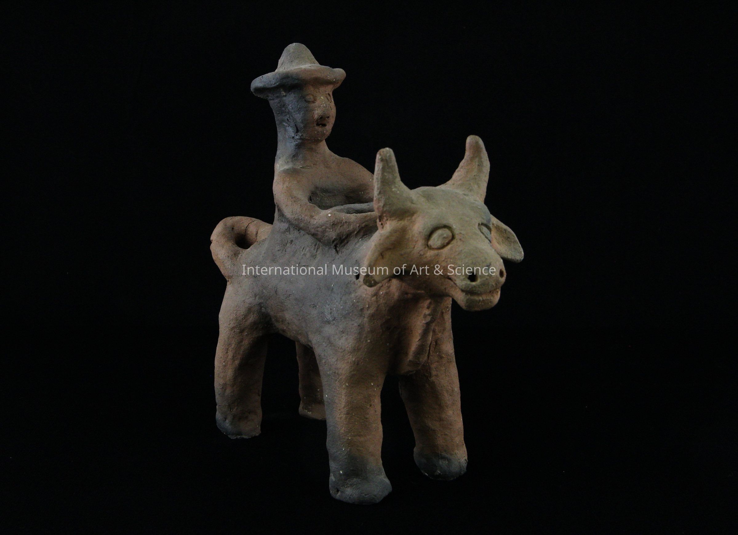 A ceramic candlestick in the shape of a man riding a bull. The rider wears a hat and has his arms around the area where the candle goes. The piece is made from a burnt orange/red colored clay and is unglazed. It has black burn marks throughout from the firing process.