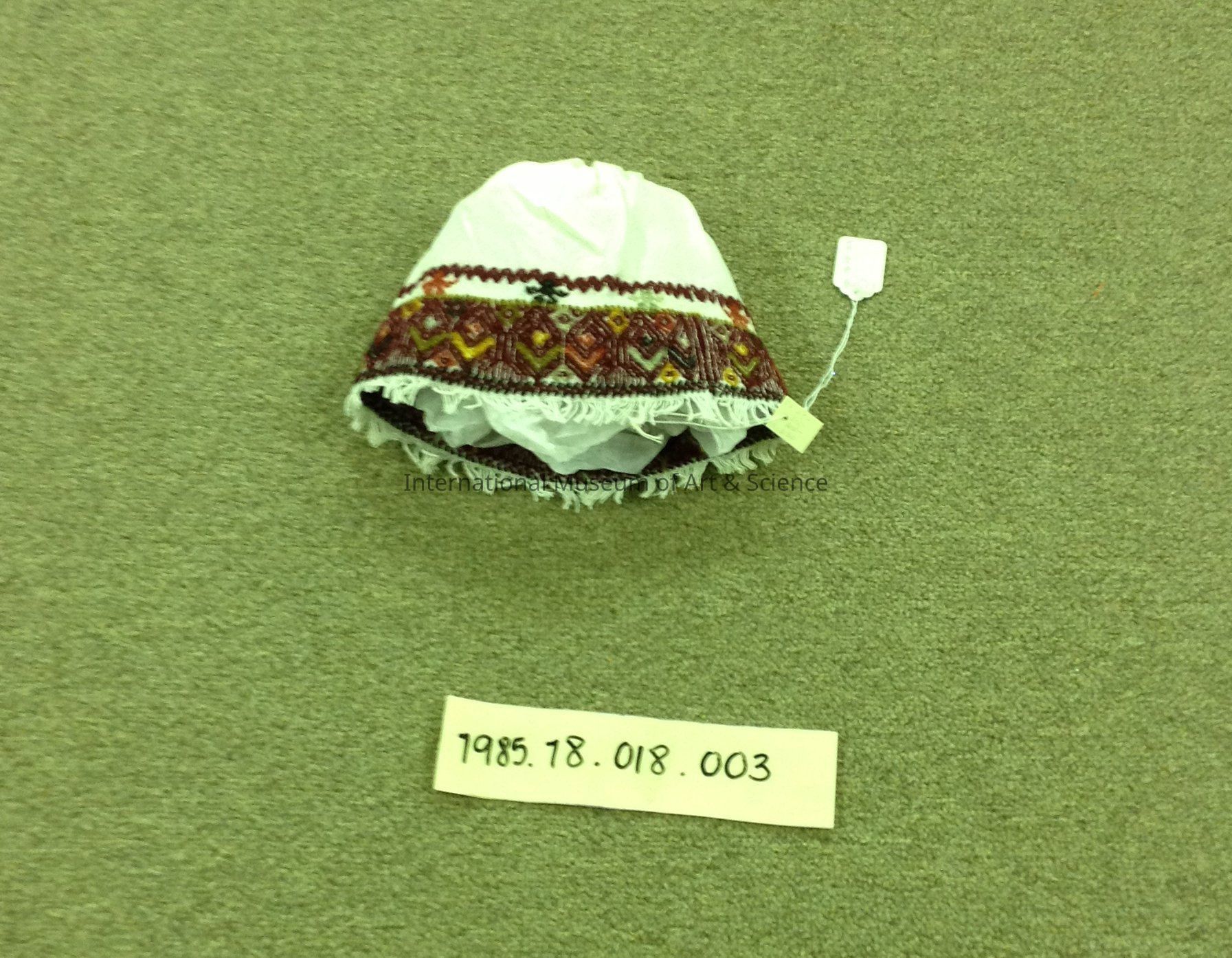 An infant's cap. The white cotton cap is decorated with maroon wool designs and multi-colored monkey and floral motifs.