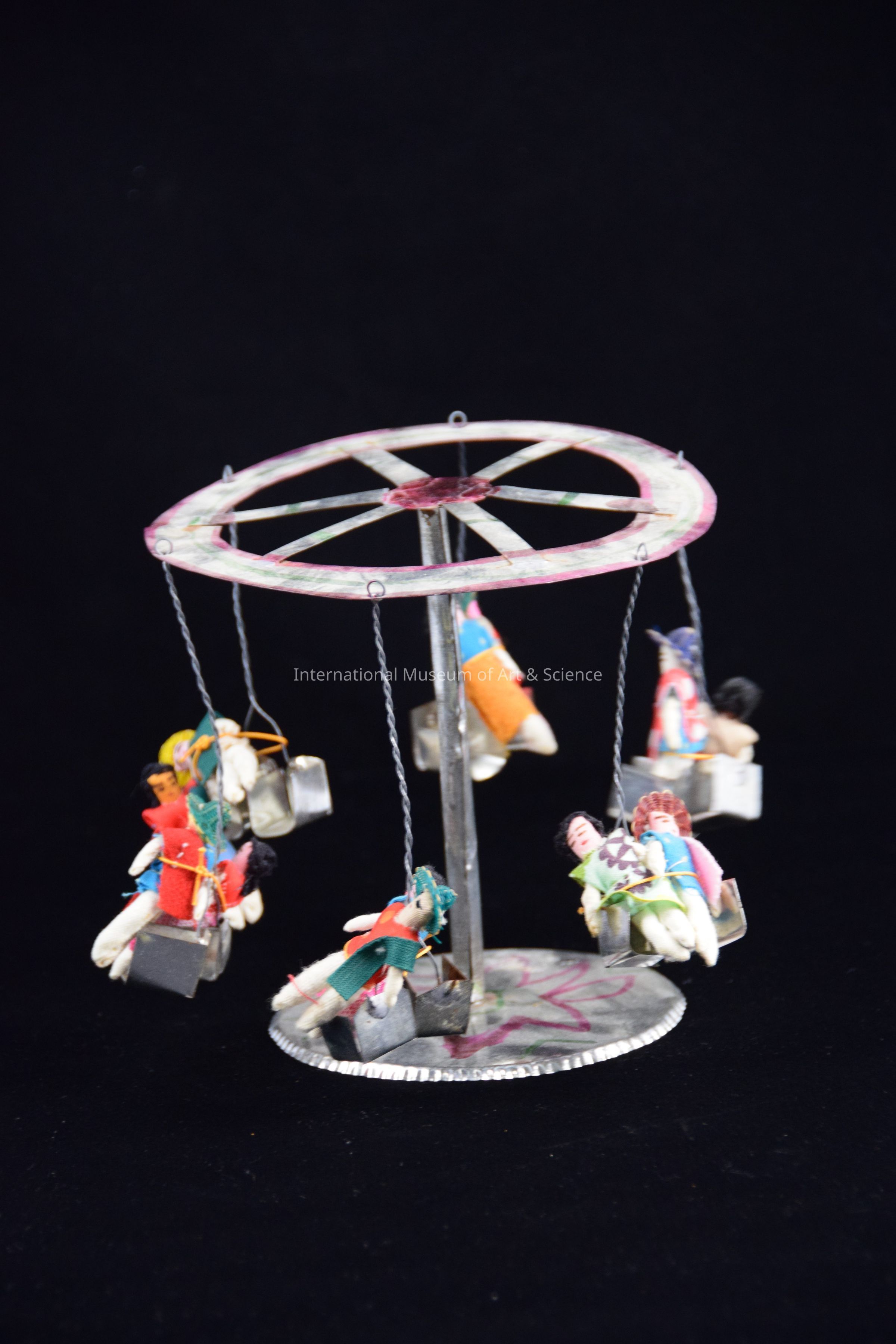 A tin carousel. Shows cloth riders in on chairs. The carousel is decorated with painted designs.Artwork Details