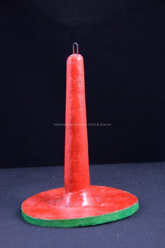 A ceramic pillar on a stand. This is the center pole for the Carousel. It is painted red with a green stipe at the base. It has a wire loop at the top of the pillar. It is part of a Carousel sculpture.Artwork Details