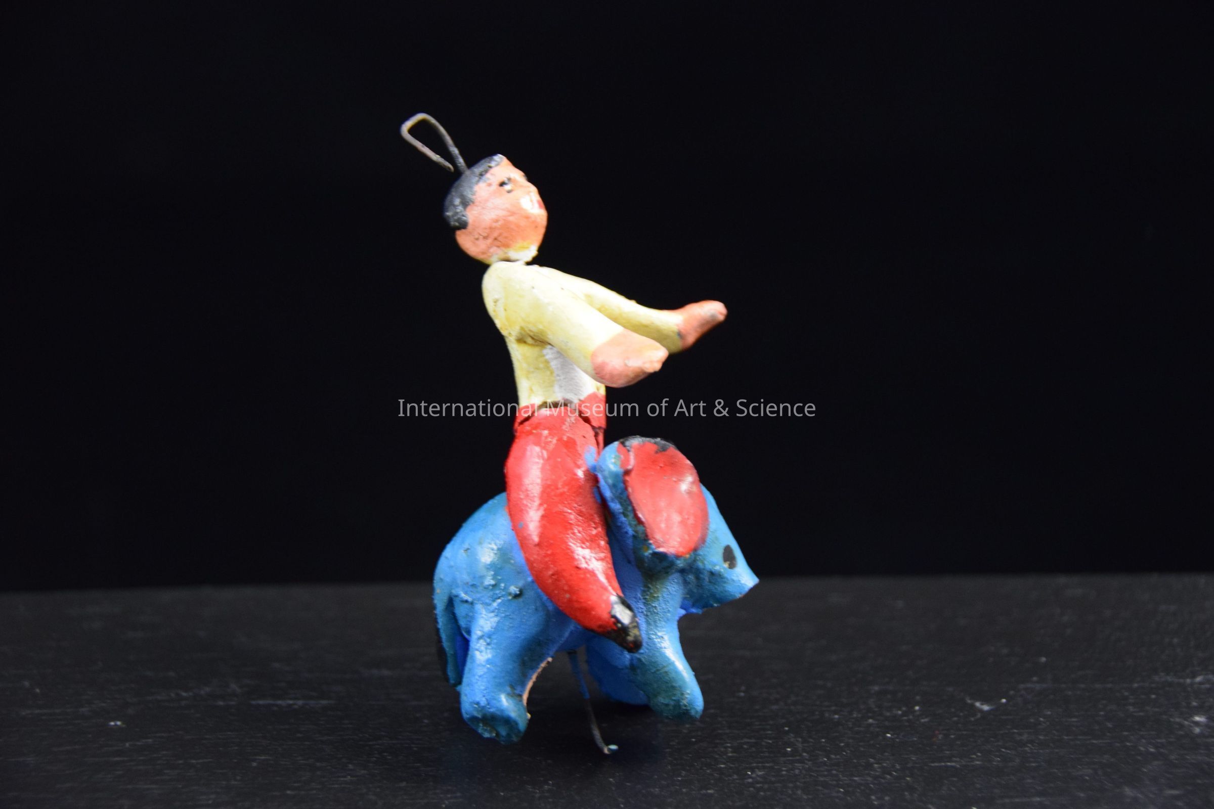 A ceramic figurine of a man riding an elephant. The figurine is wearing a white shirt and red pants. The elephant is blue in color. It has red and black ears. This figure is part of a Carousel sculpture.Artwork Details