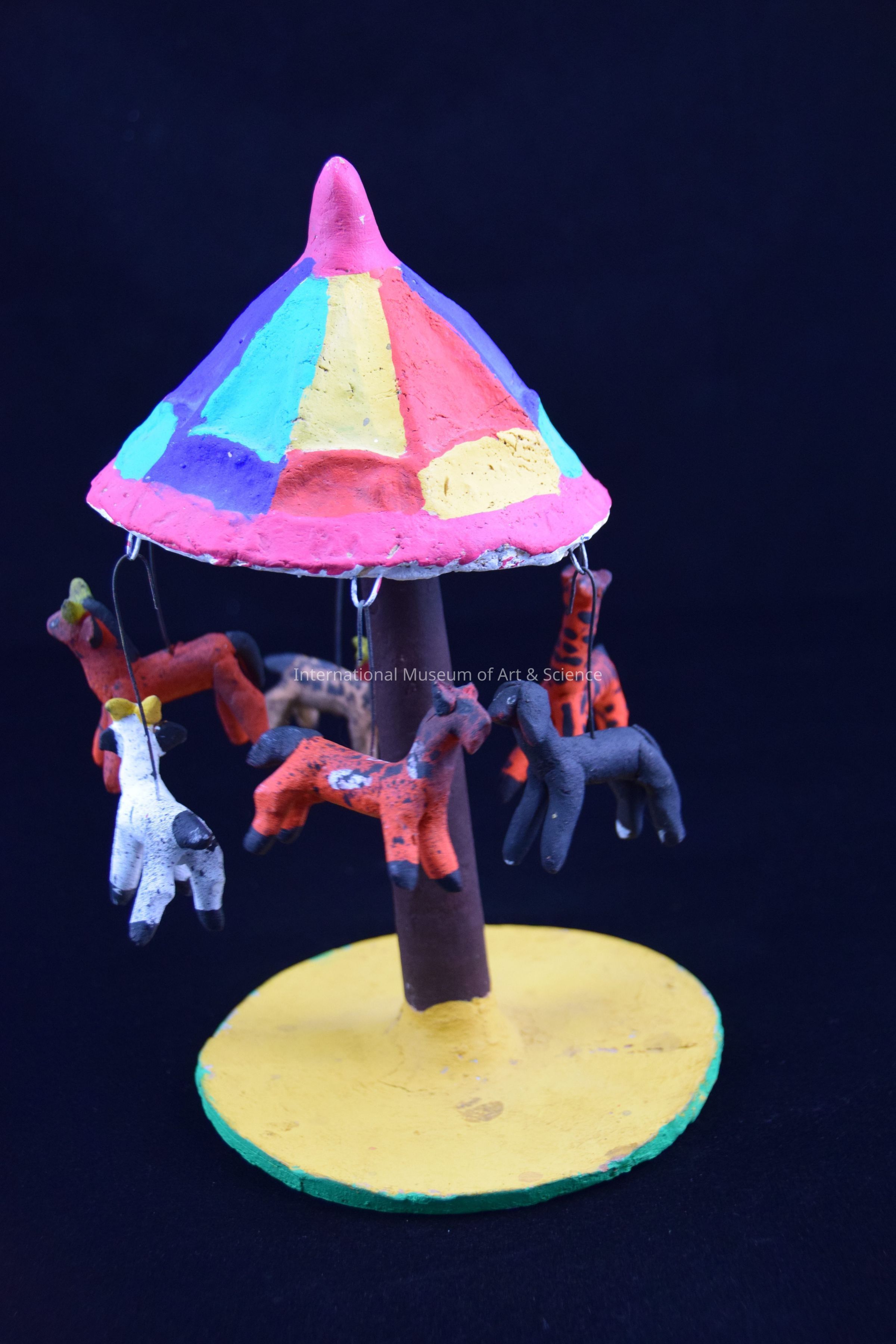 A ceramic roof. This is the roof for the Carousel. It is painted with bright colors - red, blue, yellow, green, purple, and pink. Is it circular with a domed top. It has a wire loops around the bottom edge for the figurines to hang from. It is part of a Carousel sculpture.