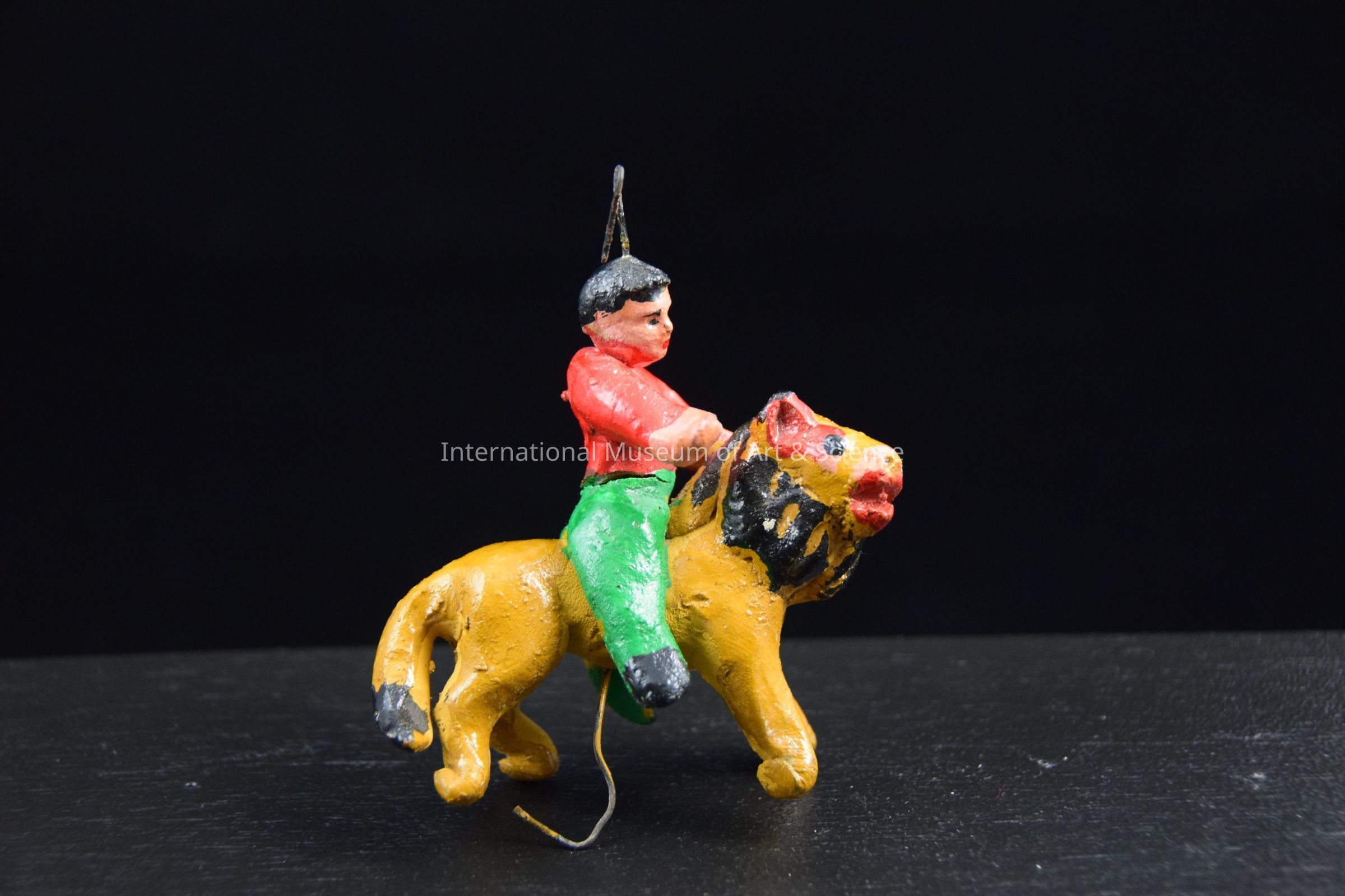 A ceramic figurine of a man riding a lion. The figurine is wearing a red shirt and green pants. The coyote is a light brown in color. It has a black mane, red ears and a red mouth. This figure is part of a Carousel sculpture.Artwork Details