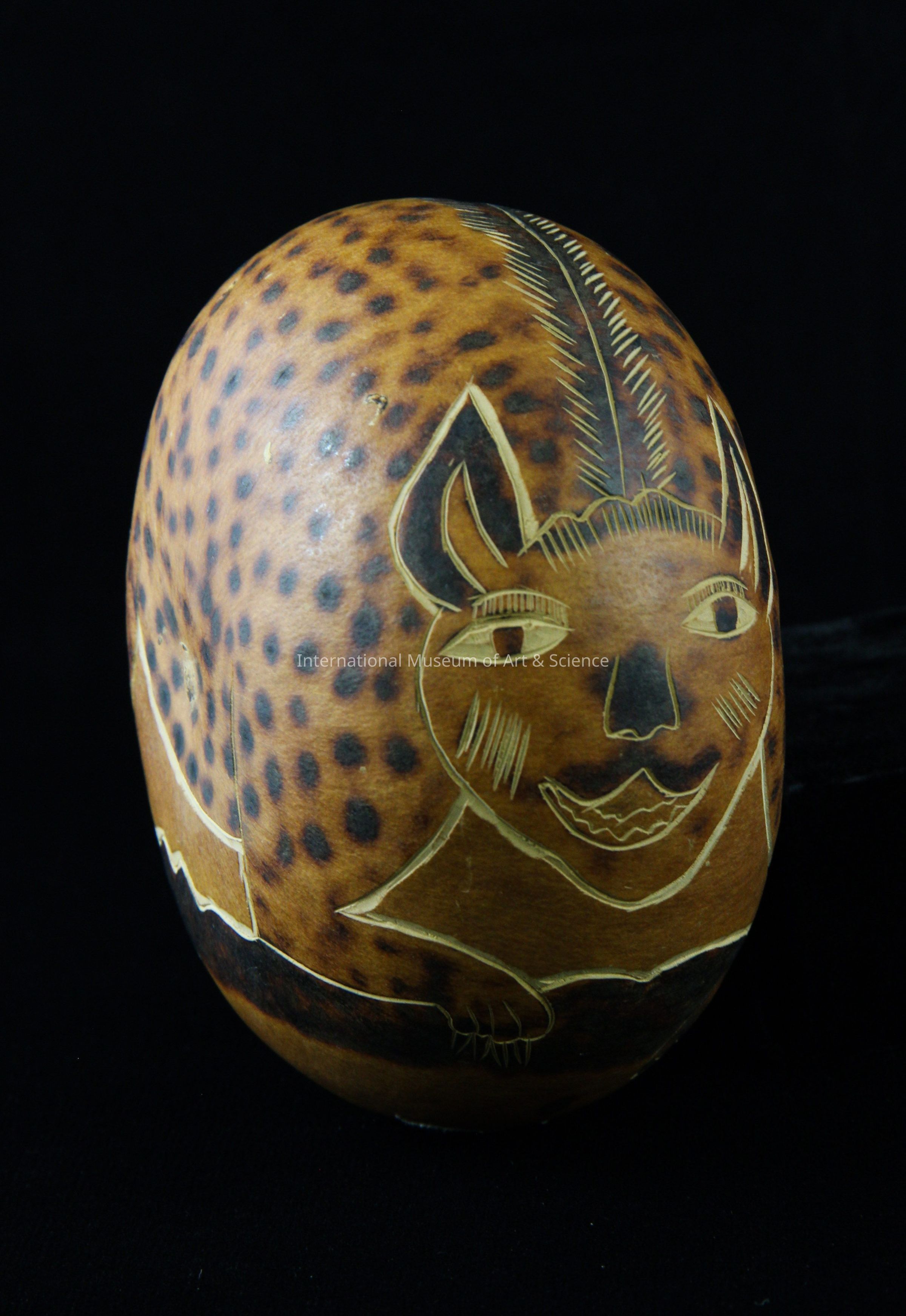 A cat carved from a gourd. The outline and some details have been carved into the skin of the gourd to create the cat images. A black stain or dye has been used to add details to the cat including spots and facial details.