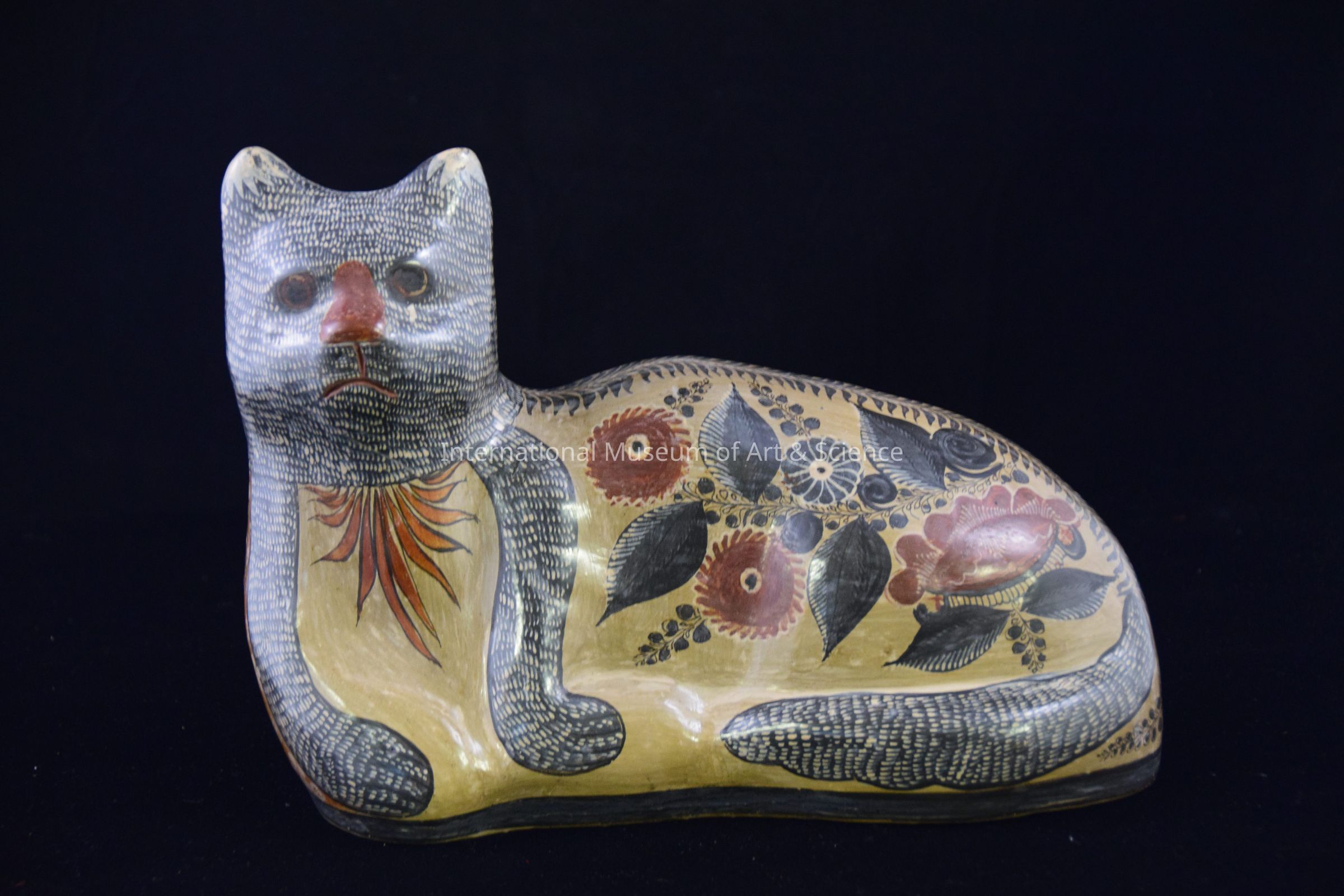 A ceramic figurine of a seated cat. The base of the body is tan with an orange, red, and grey floral motif and cat stripes.