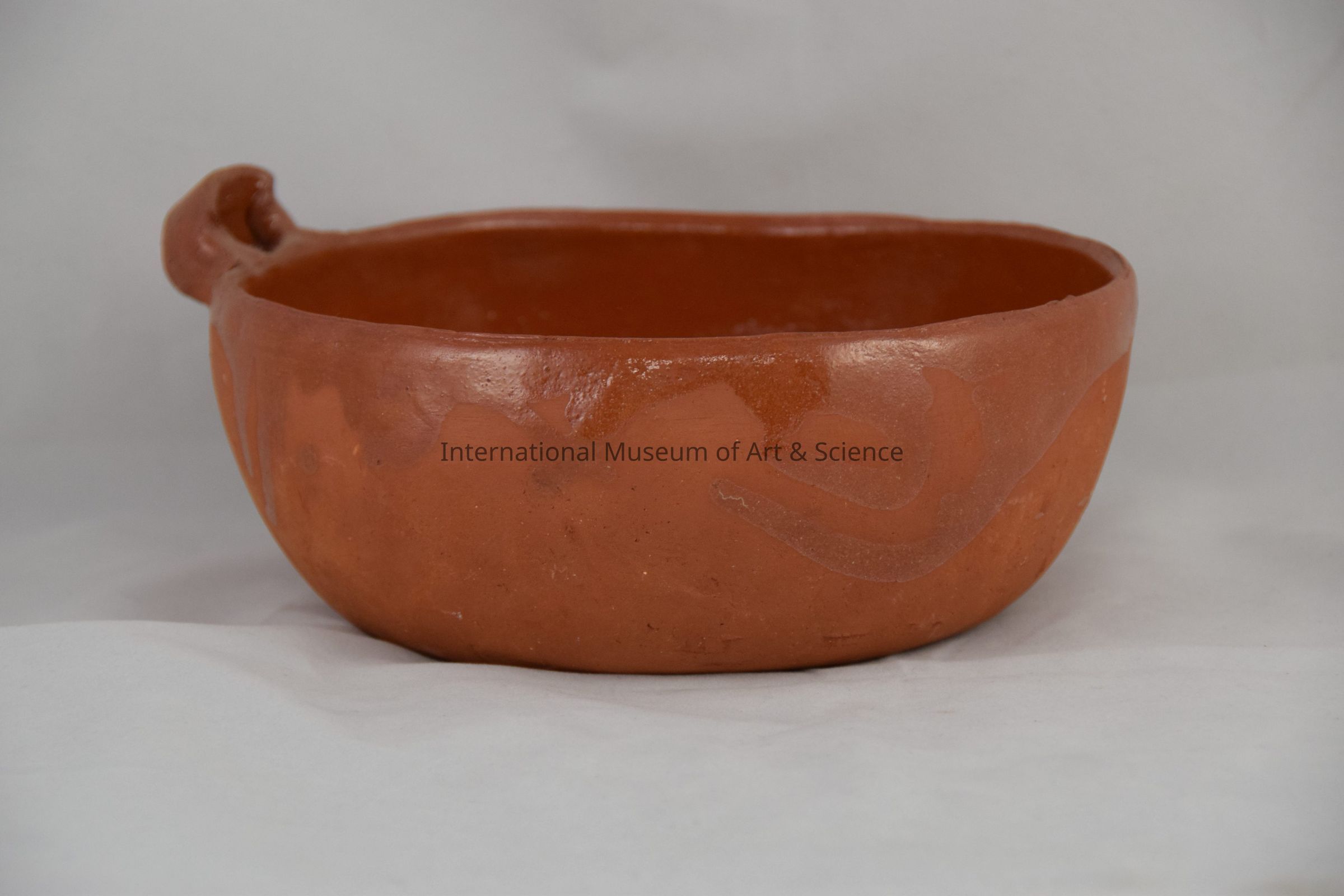 Bowl. Jesus Maria, Jalisco. Maker unknown. Clay, glaze. 1988. Natural brown clay bowl with single handle; interior glazed; exterior plain with touches of glaze streaks; wide shallow bowl.Dimensions